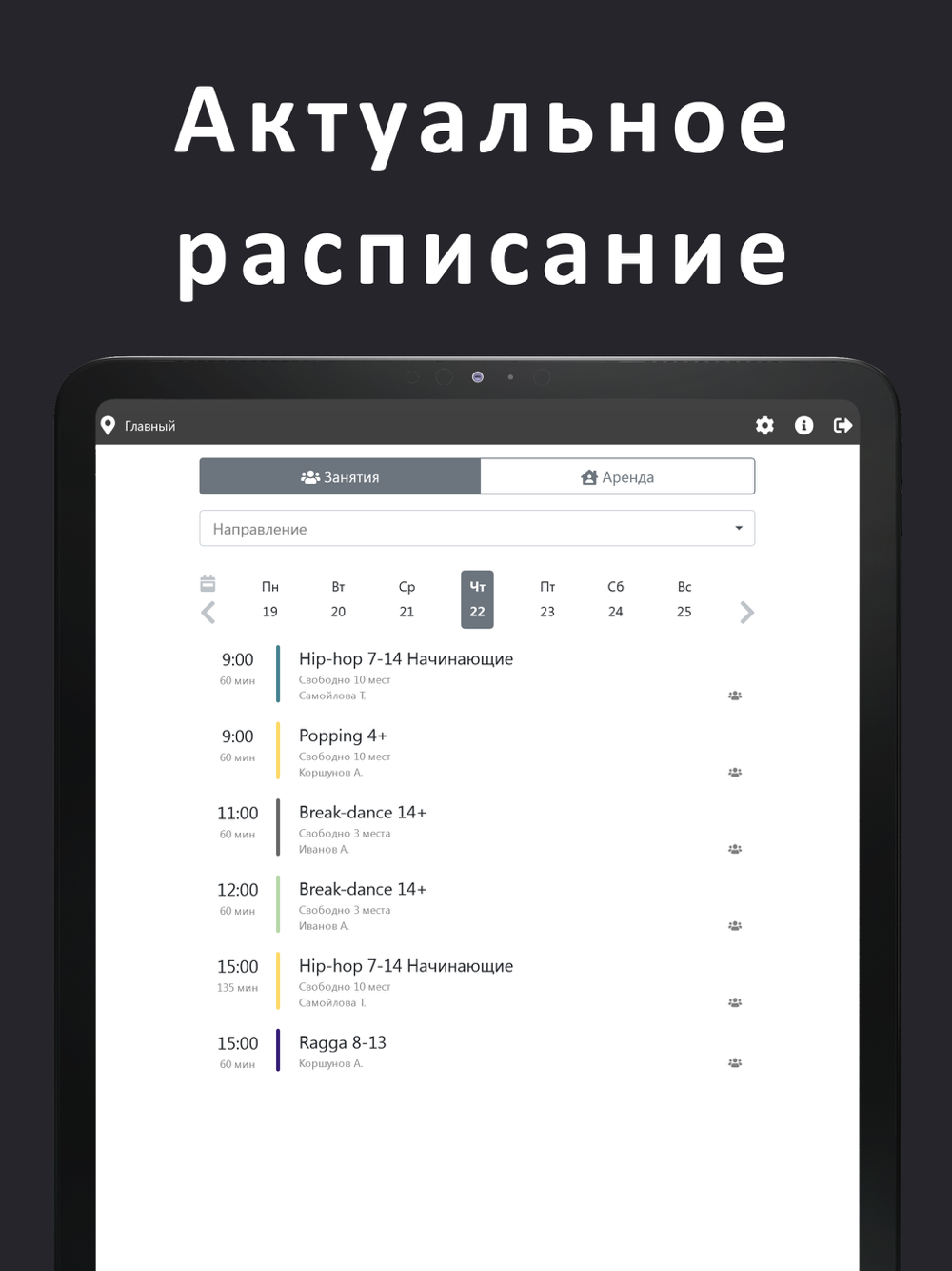 Приложение для удобной записи на тренировки, также полная информация о абонементах, покупках и посещениях.