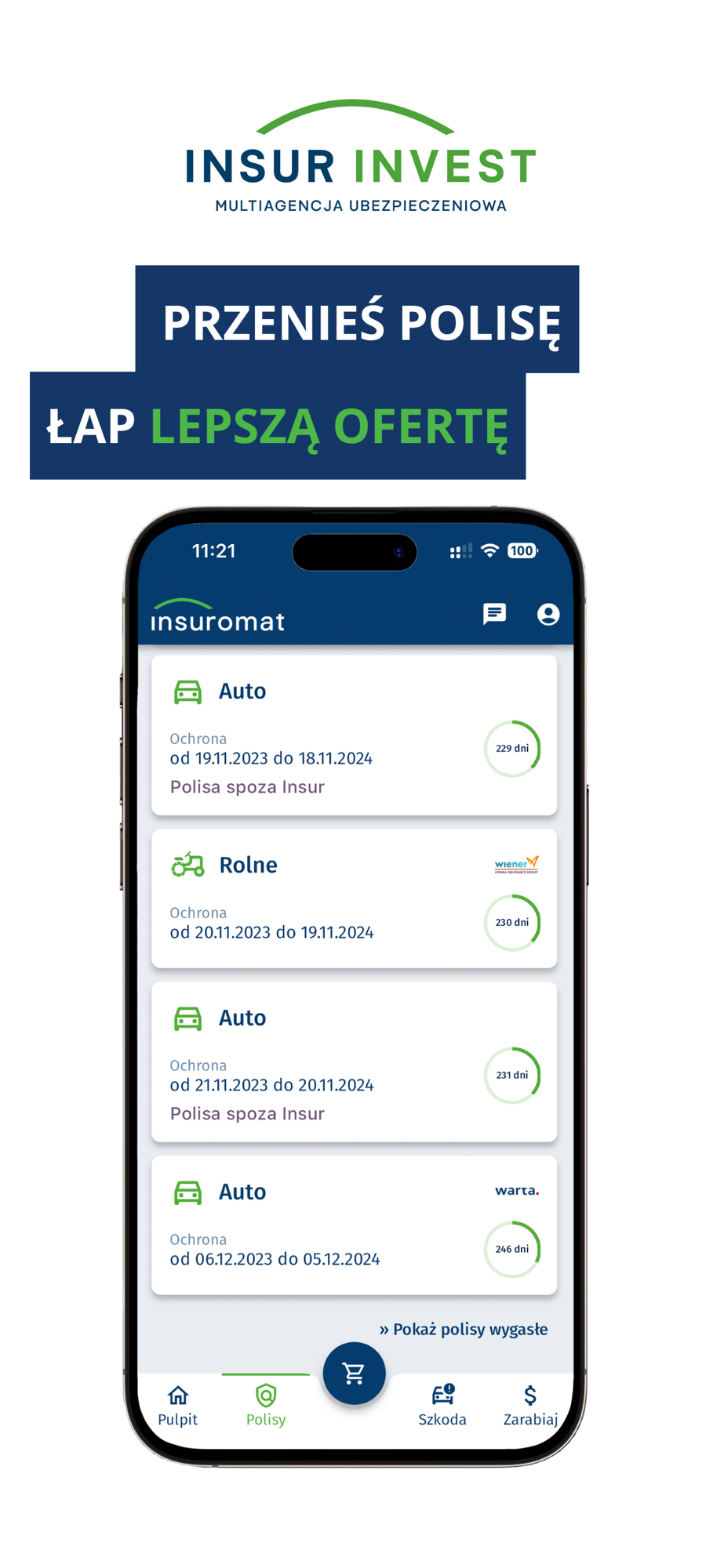 Zdarza Ci się zapominać o terminie opłacenia polisy? Z Insuromatem już nie zapomnisz. W panelu głównym aplikacji zobaczysz kiedy dokładnie wygasa Twoje ubezpieczenie. To wszystko w jednym miejscu!
