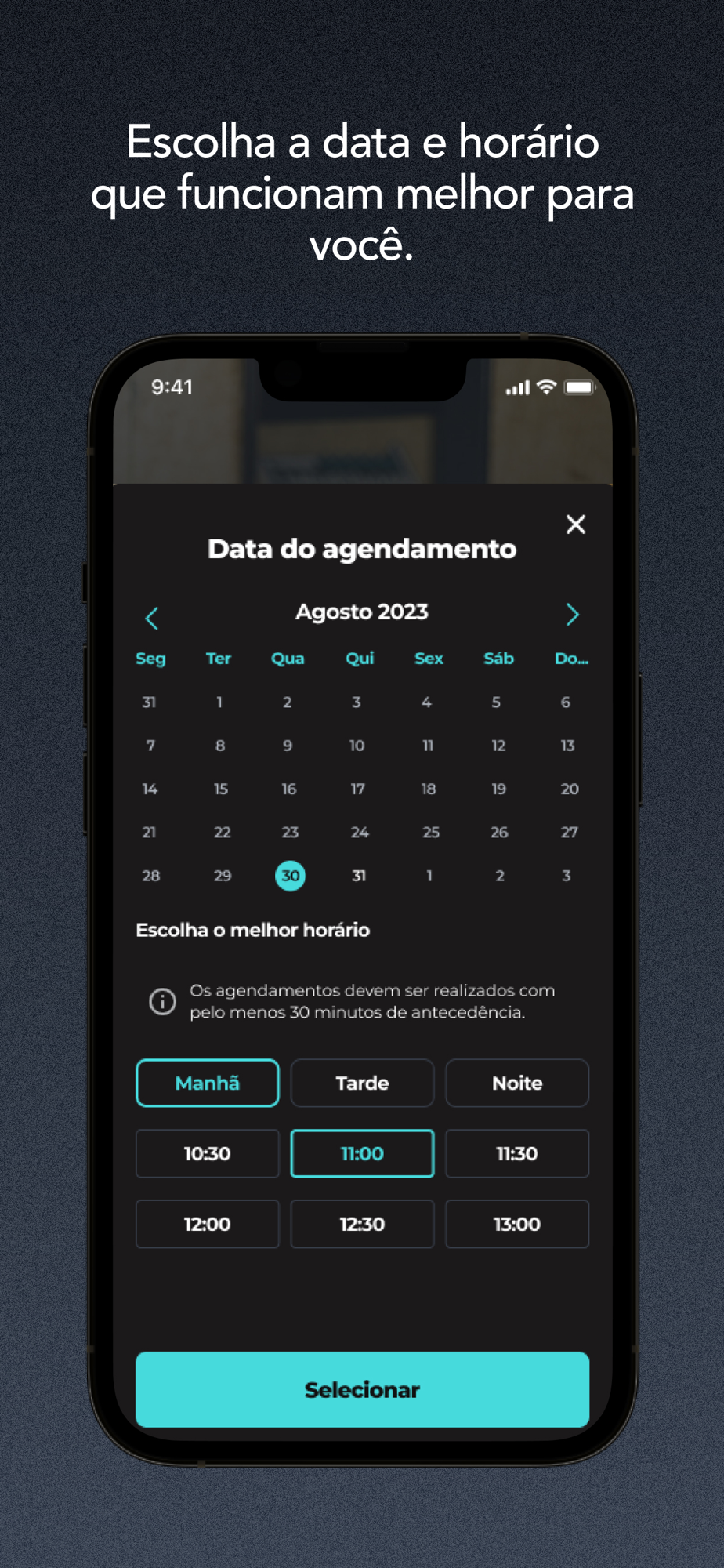 Na tela inicial, é possível selecionar os serviços e horário desejado para seu próximo atendimento.