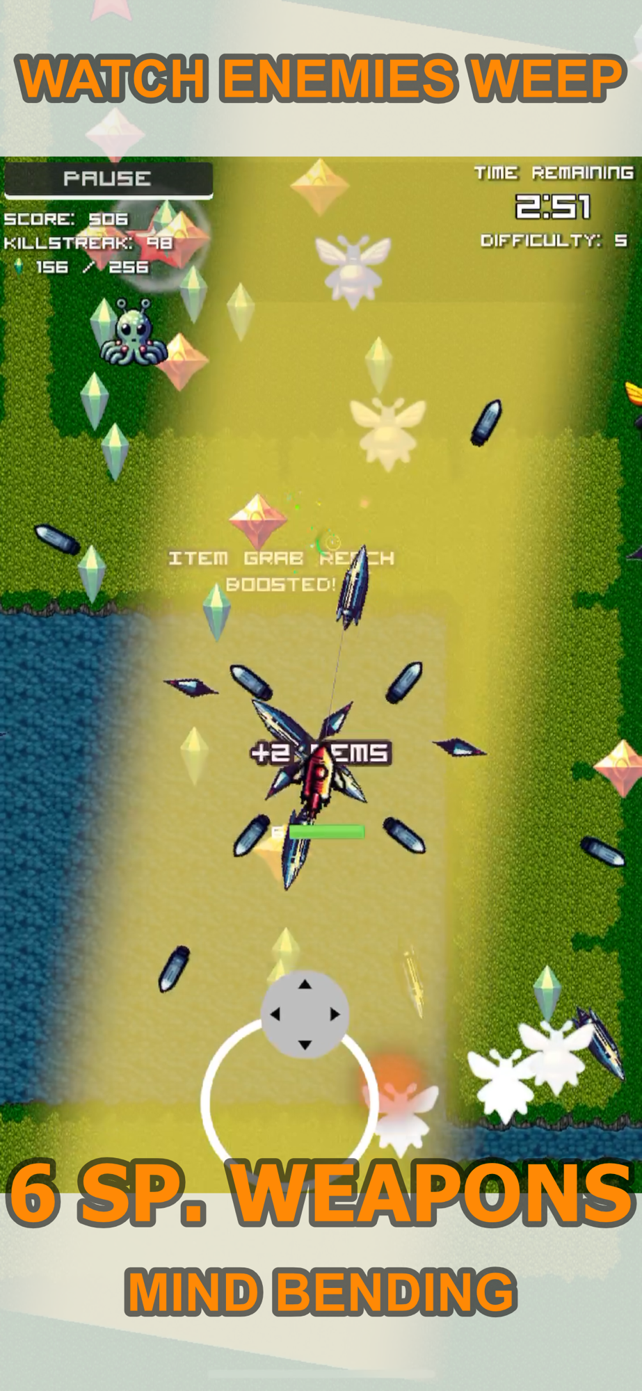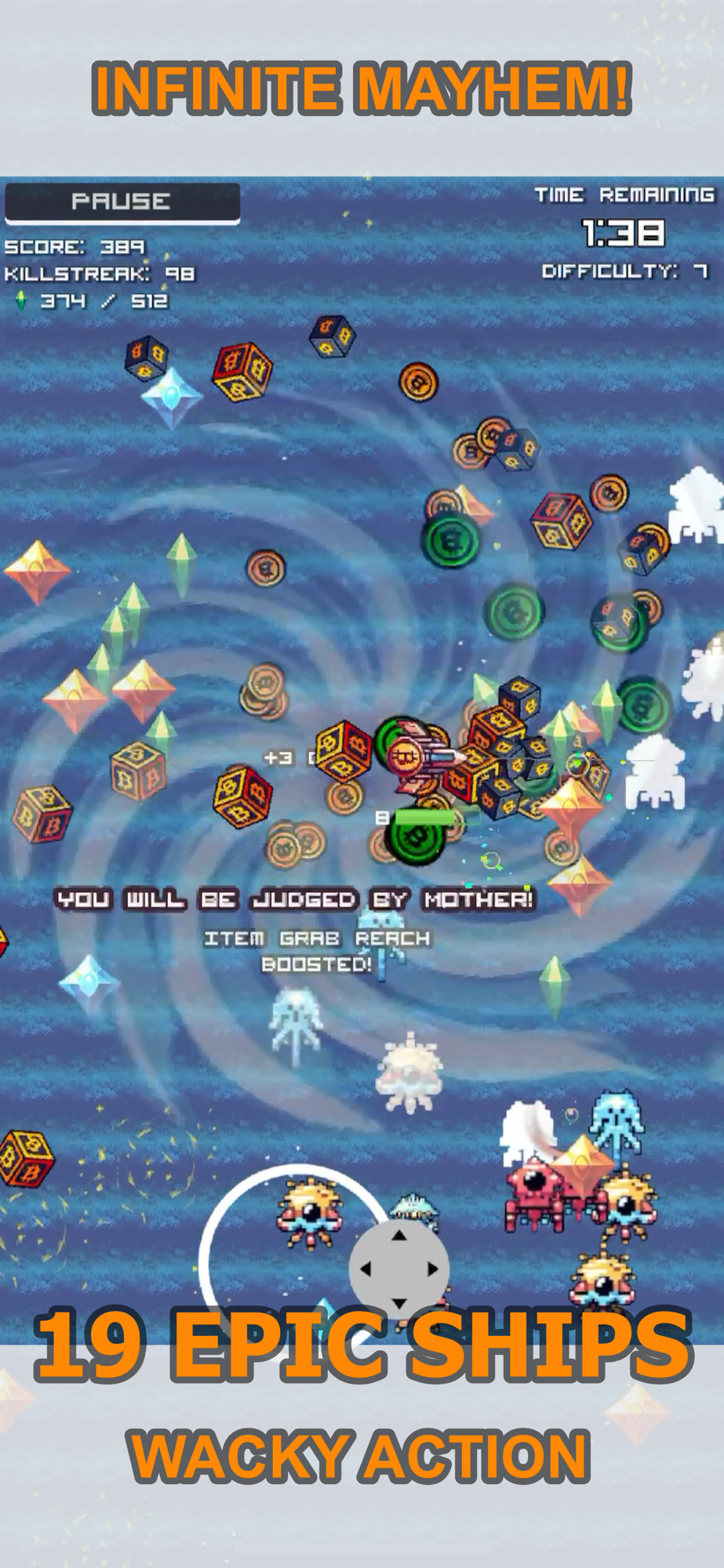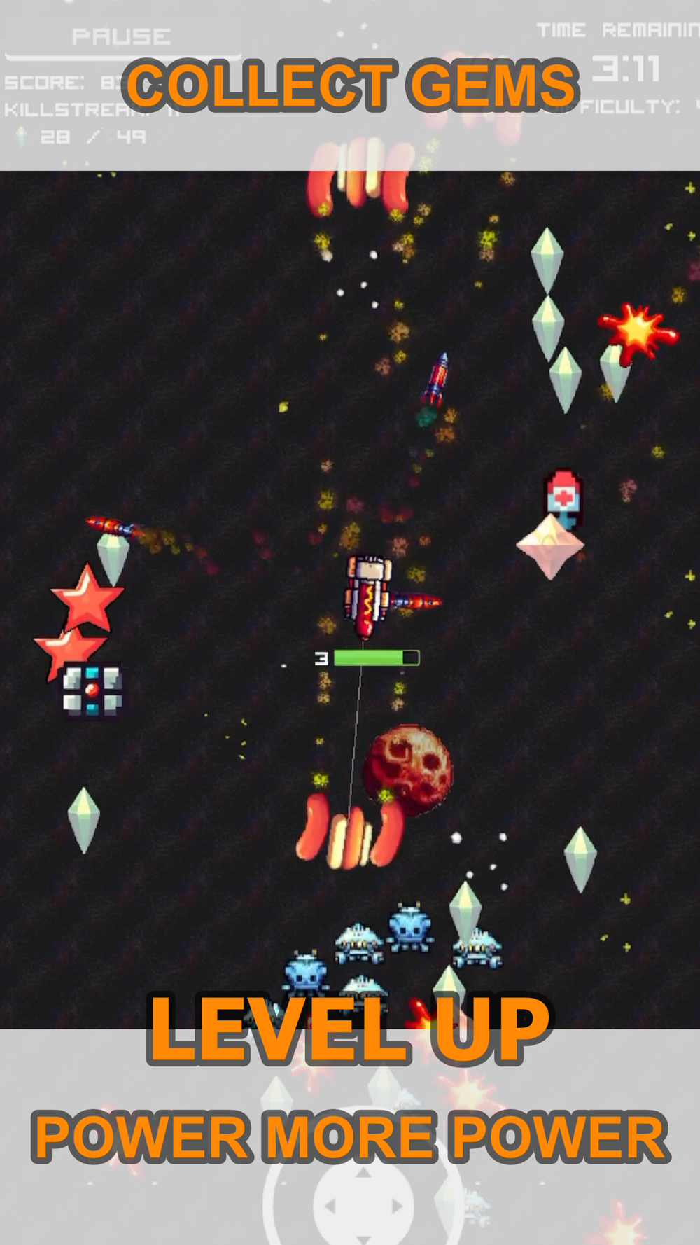 Level Up System: Collect gems and power-ups to upgrade your ship and survive longer.