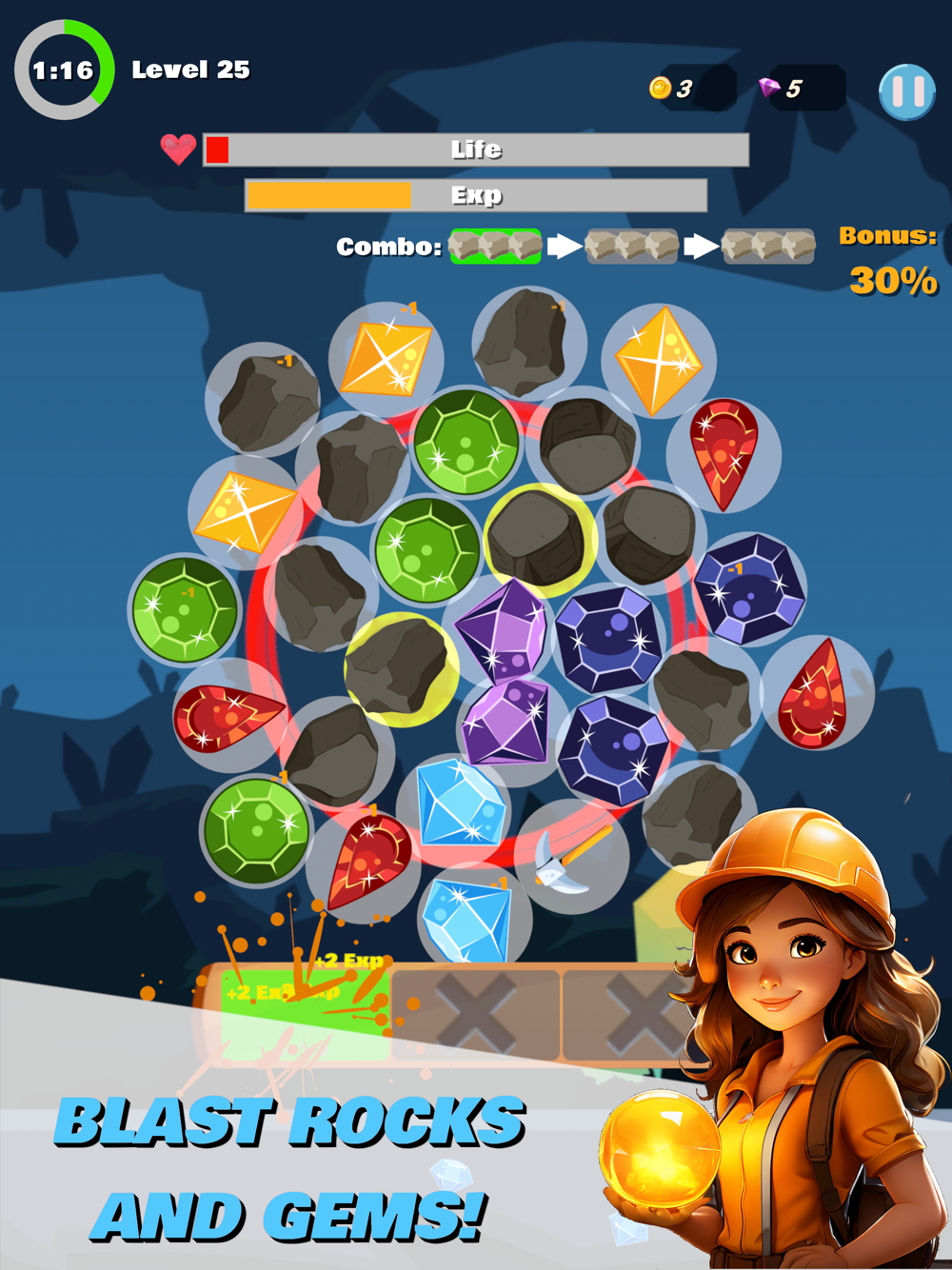 * Choose your strategy while playing unique levels featuring different eggs, gems, rocks, stripes, and power up items to match