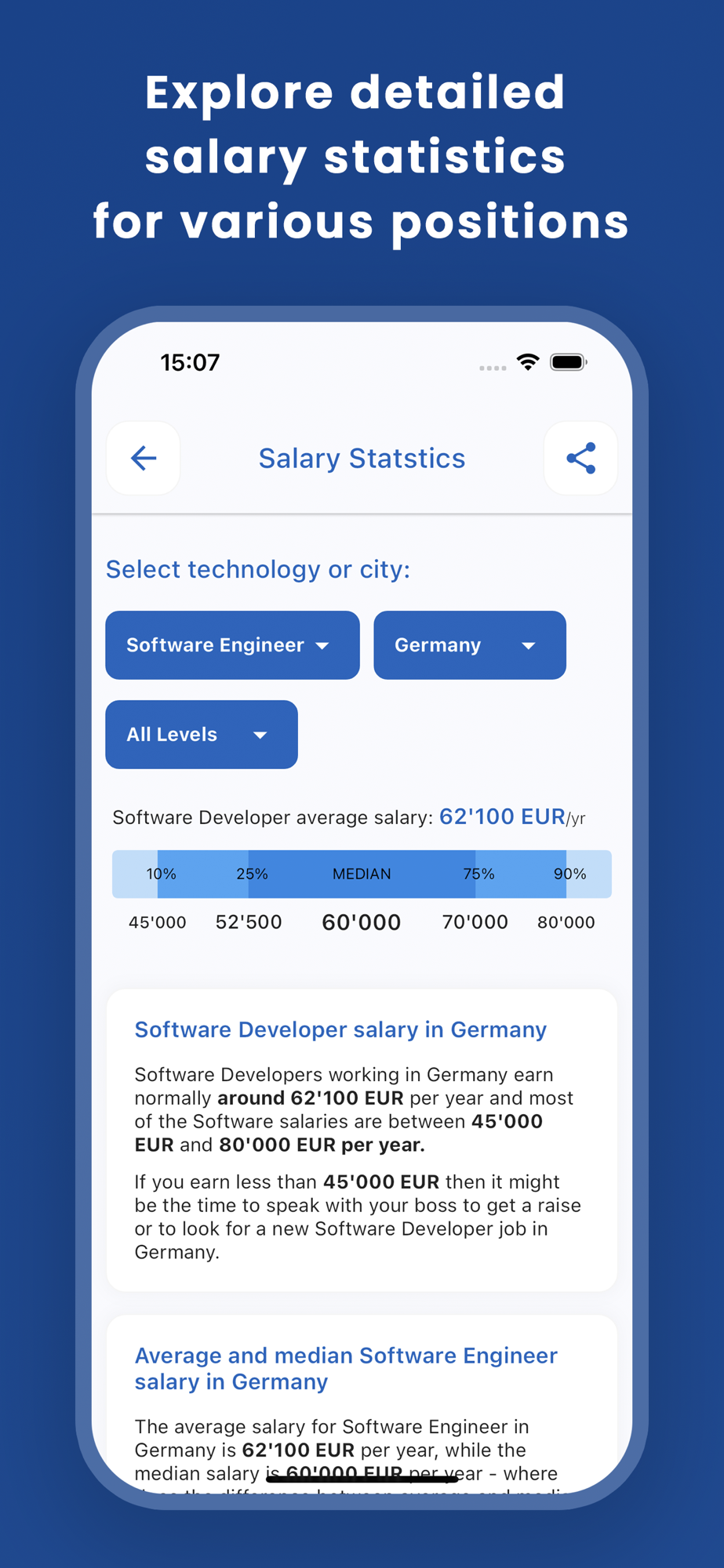 Make well-informed decisions with confidence. GermanTechJobs provides comprehensive salary data, categorized by technology and city. Gain insights into industry standards and match your expectations with your experience and role. No more uncertainty in today's dynamic IT job market.