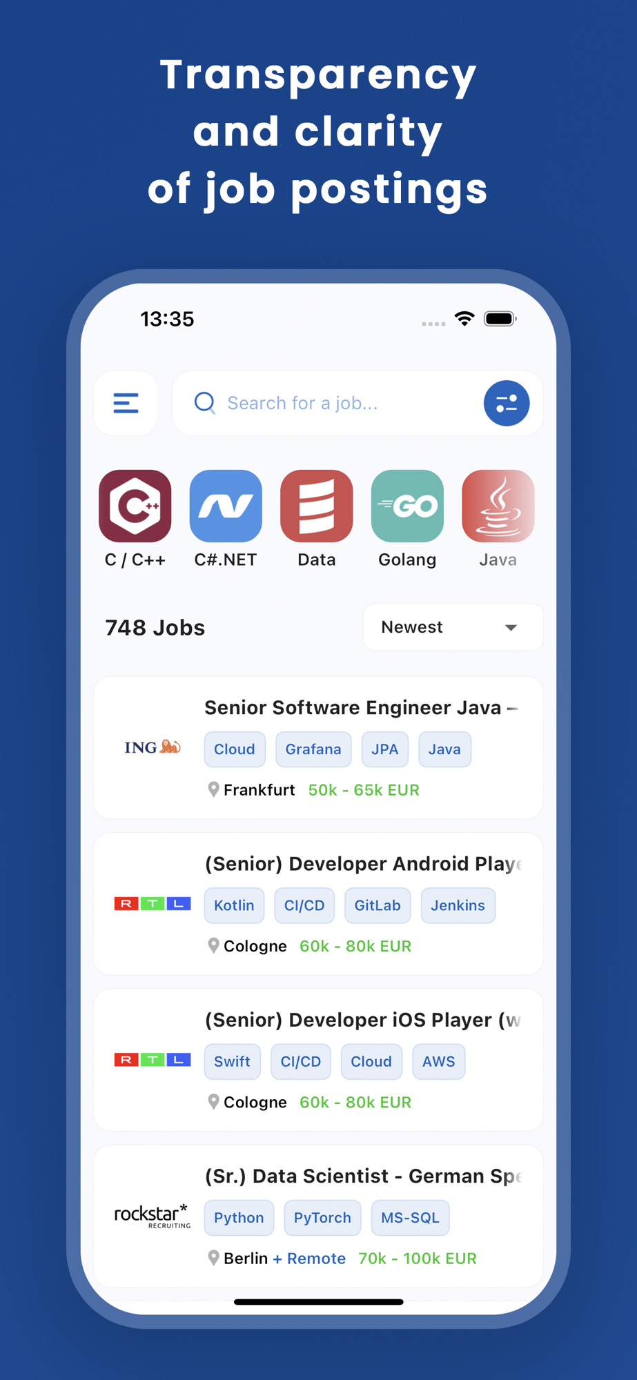 We've compiled an extensive collection of job listings from all over Germany and organized them in a user-friendly interface. Explore roles that align with your salary expectations, preferred technologies, and desired locations. Bid farewell to searching across multiple websites — we've got you covered!