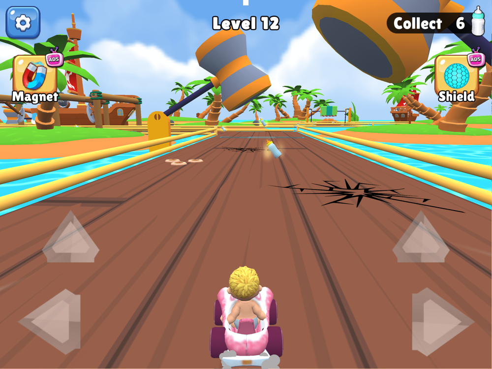 There are many hindrances to overcome in Babby Kart Rider: dodge the giant Wood Mullets, jump over wheel-crashing Trap Teeth, evade the Tall Collumns and collect Milk Bottle on the way to unlock the kart you want.