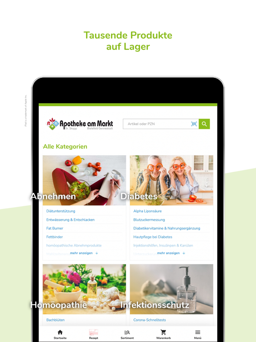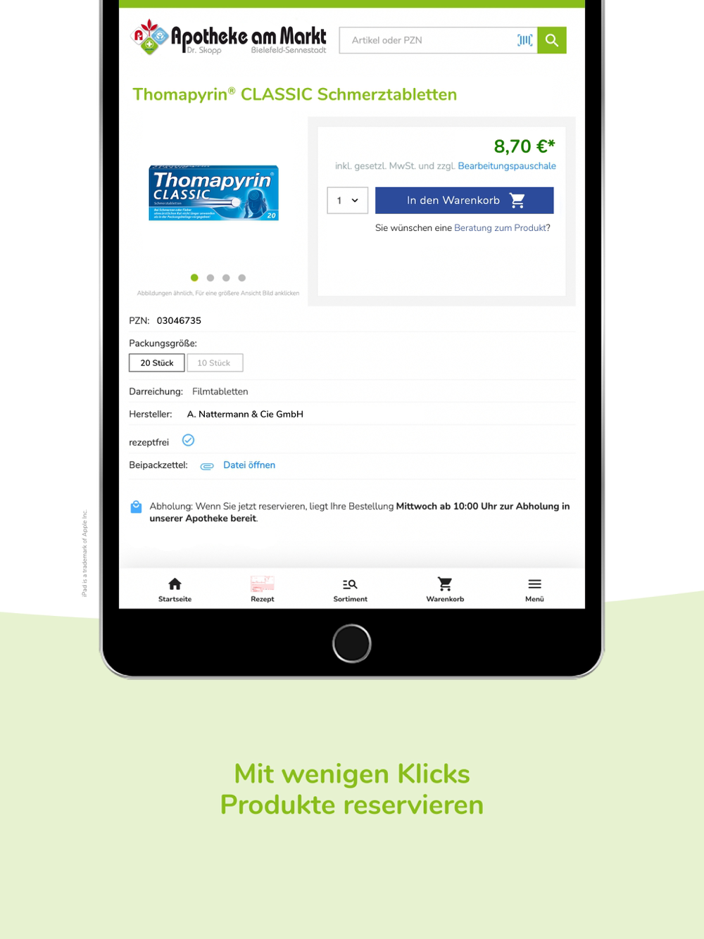 Wir bieten Ihnen über die App unser gesamtes Sortiment. Nicht sofort verfügbare Produkte bestellen wir für Sie und machen Sie in der Regel bis zum nächsten Werktag abholbereit. Gerne liefern wir Ihnen Ihre Bestellung per Botendienst direkt nach Hause.