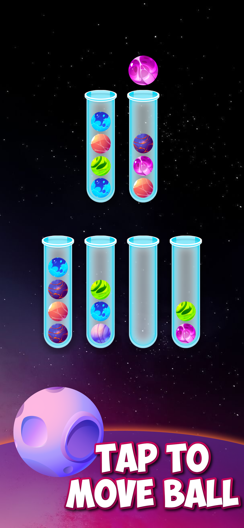 The game's difficulty increases as the player progresses, with more tubes and balls of various colors being introduced. It requires careful planning, strategic thinking, and sometimes a bit of trial and error to find the solution. The visually pleasing design of the game, with brightly colored balls and simple yet elegant graphics, adds to the user experience.