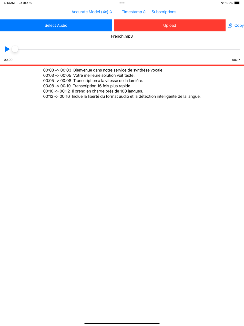 Wave goodbye to compatibility concerns! Transcribe effortlessly handles popular audio formats such as mp3, flac, ogg, m4a, wav, and aiff. No matter the source, our application guarantees a seamless transcription experience, turning your spoken words into accurate, time-stamped text effortlessly.