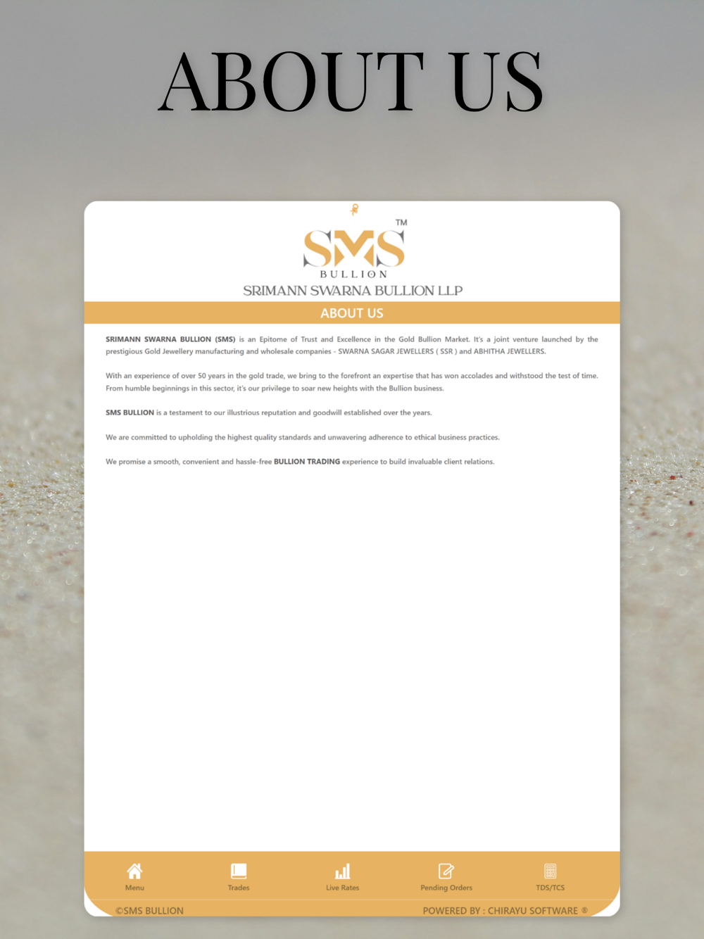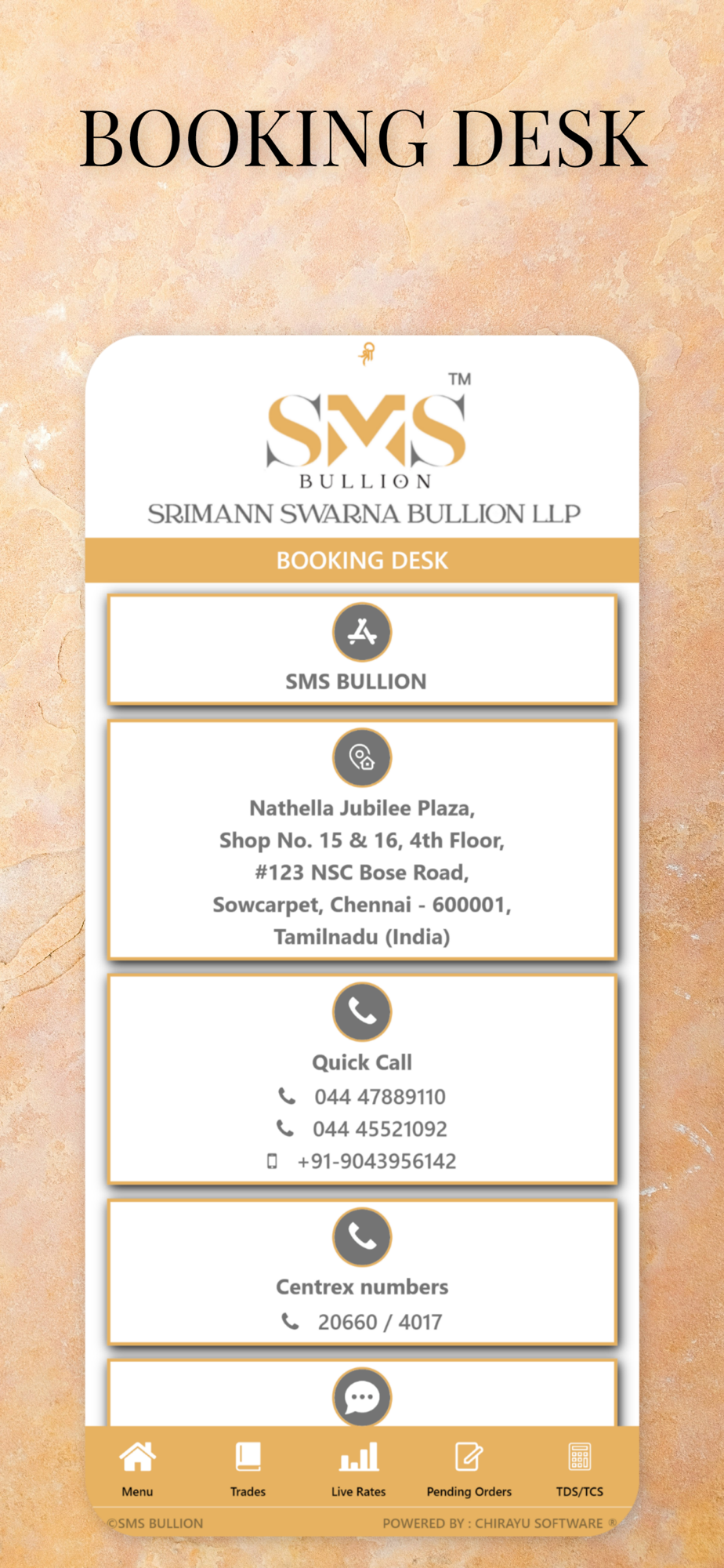 SMS BULLION, a prominent Bullion dealer in Chennai, offers a unique experience in the Bullion market through its app. This app stands out for providing the latest live gold rates and includes a TDS TCS calculator for accurate jewellery pricing. It also features bank details and a booking desk for convenient contact information.