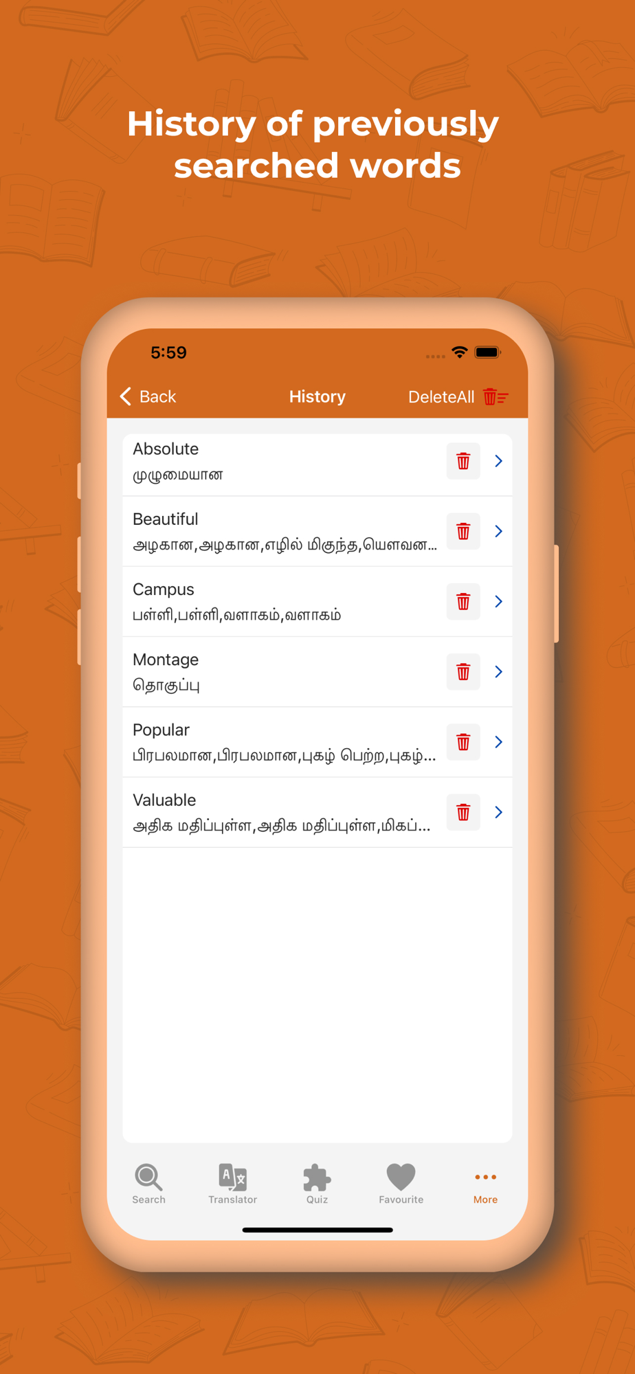 We take the history of previously searched words in English to Tamil Dictionary Offline App. Easily access and review your past searches, making it a breeze to revisit and reinforce your vocabulary. With this indispensable tool, your language mastery becomes a seamless and efficient process.
