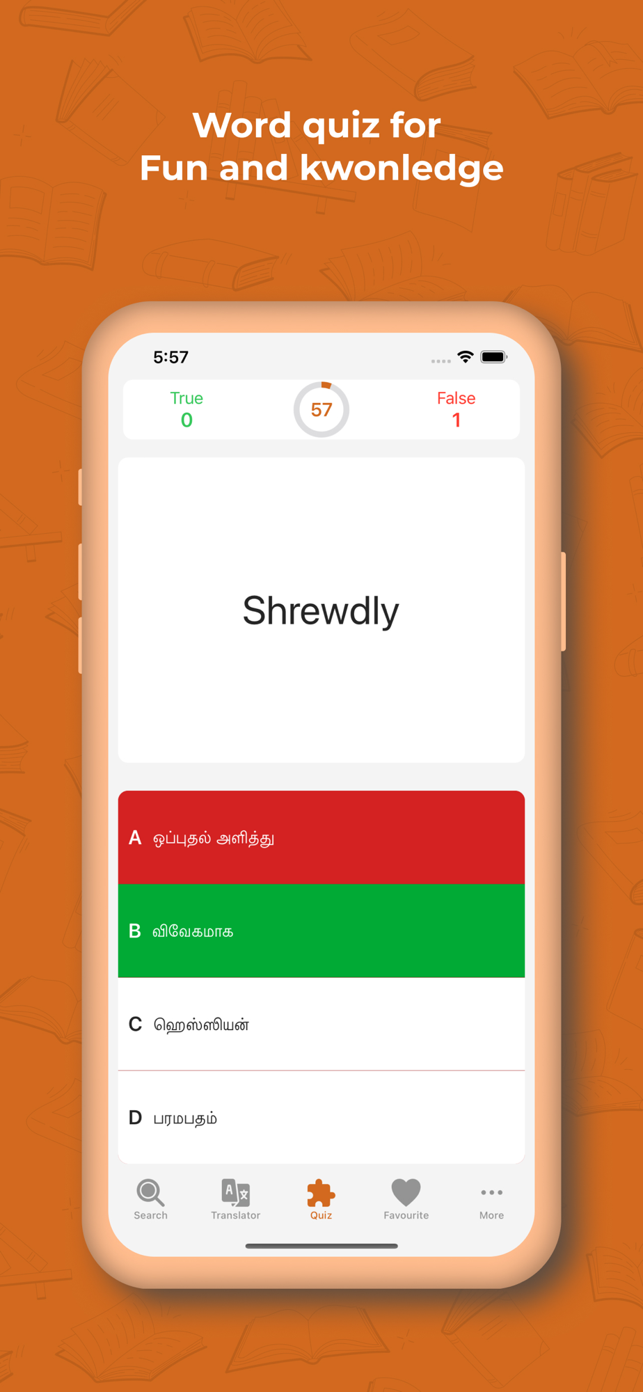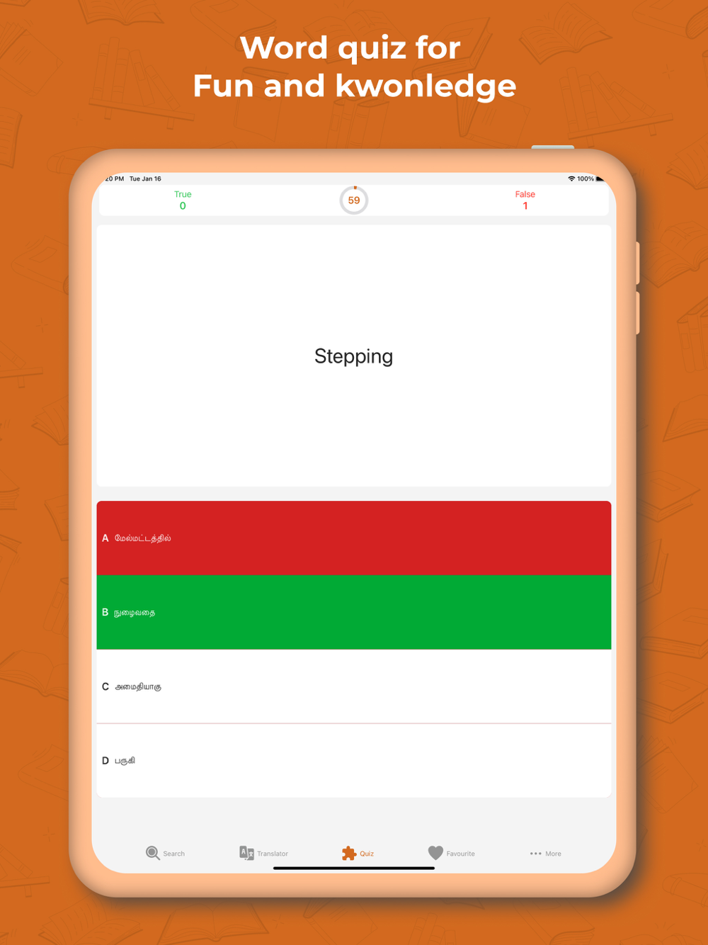 Challenge your language skills with our engaging English to Tamil Word Quiz Game! Test your vocabulary, expand your linguistic horizons, and have fun while learning. This interactive quiz game offers an exciting way to improve your command over both English and Tamil. With a wide range of words and challenging questions, you can enhance your language proficiency. Whether you're a student looking to boost your language skills or simply seeking an enjoyable word game, our English to Tamil Word Quiz Game is your perfect choice.