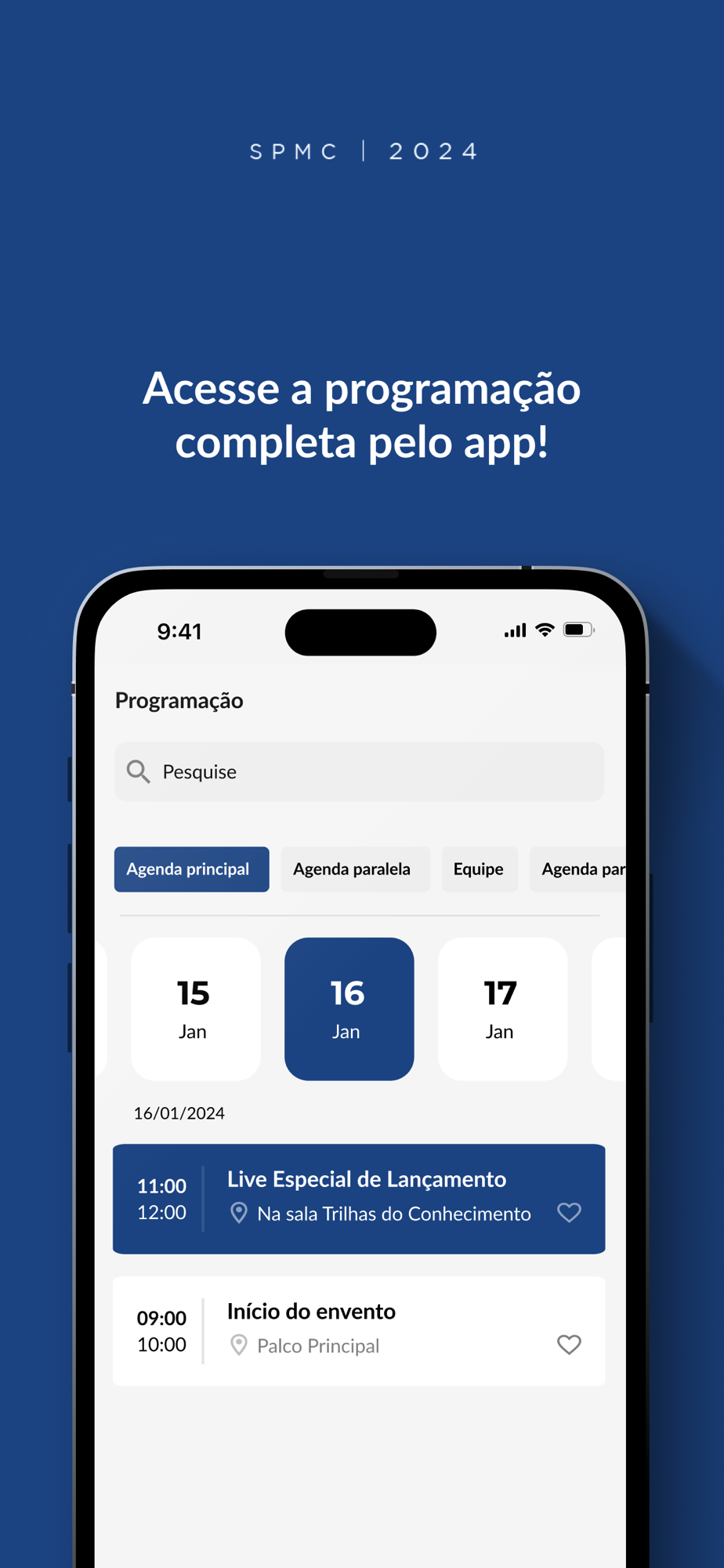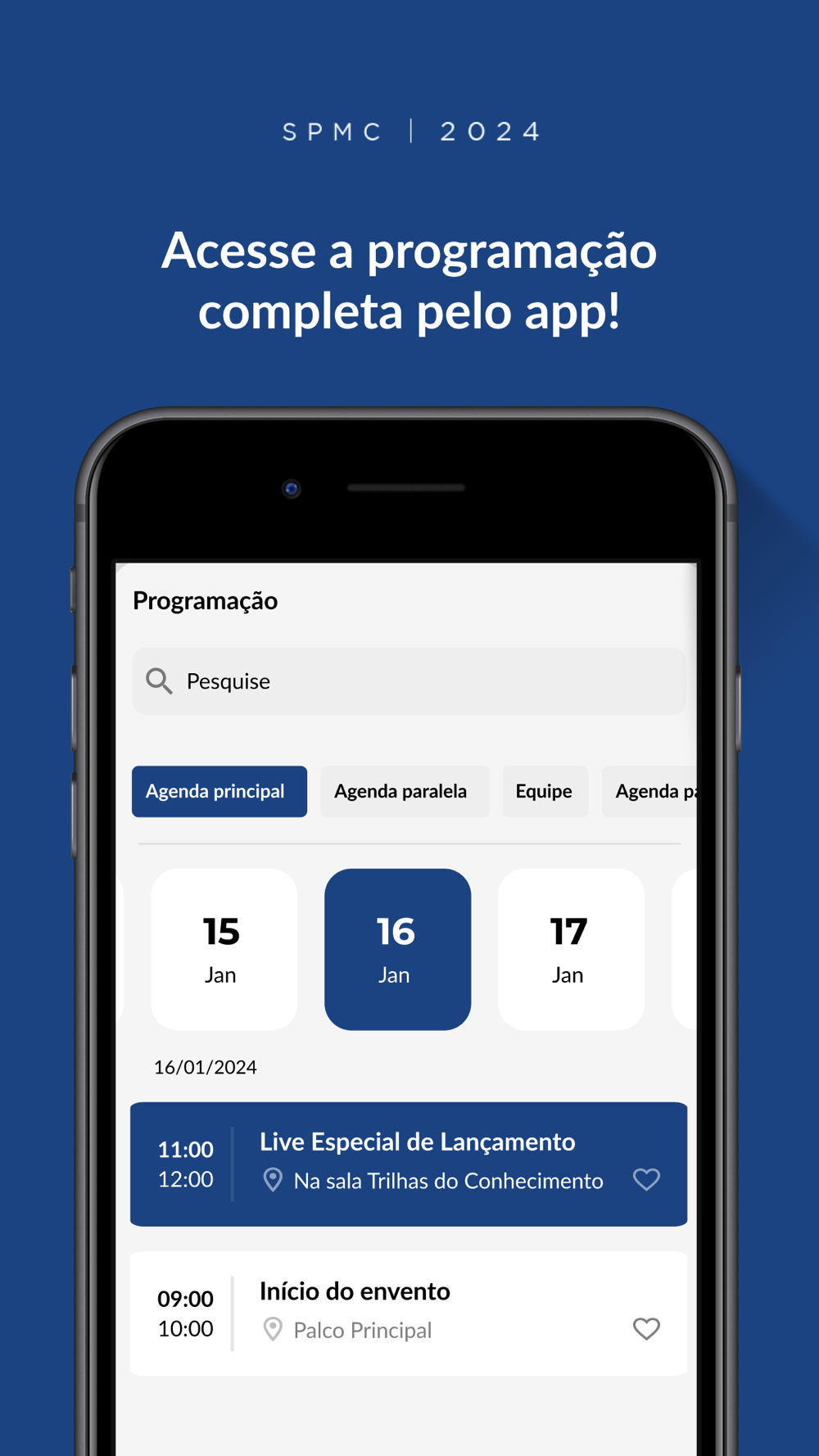 Com o aplicativo “SPMC 2024”, você tem acesso a uma rede social exclusiva, pode fazer novos contatos, enviar perguntas aos palestrantes, trocar mensagens com outros participantes, enfim, interagir com a comunidade. Além disso, você pode consultar a programação, avaliar conteúdos, dar feedback e responder quizzes. Utilize o APP e aproveite ao máximo os recursos.