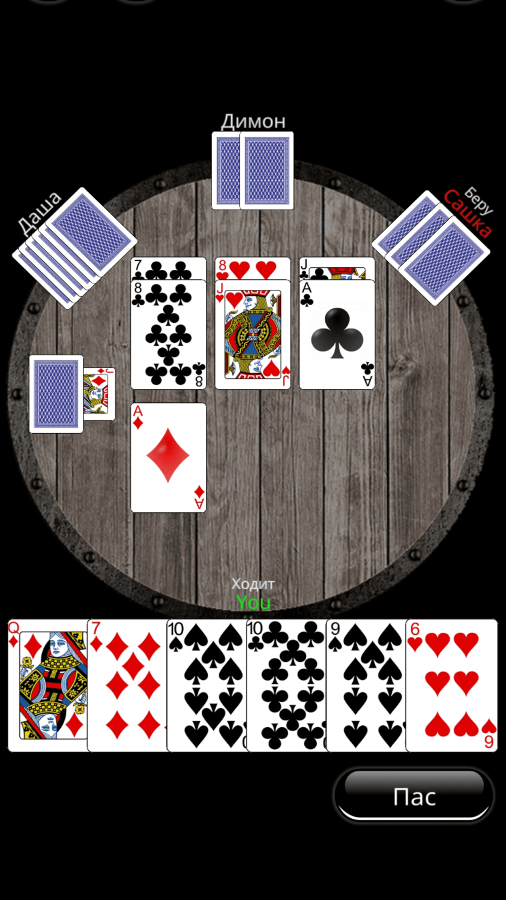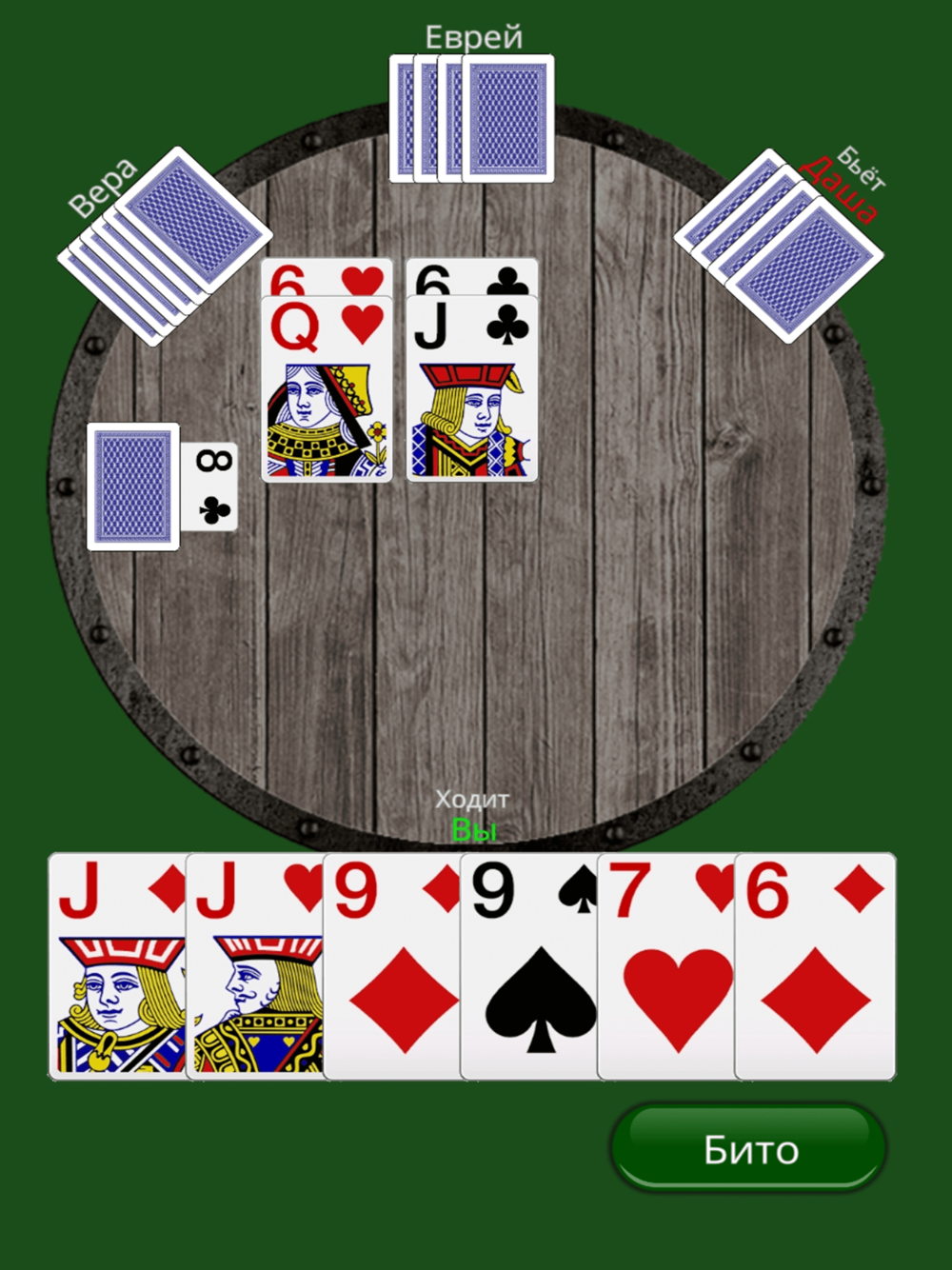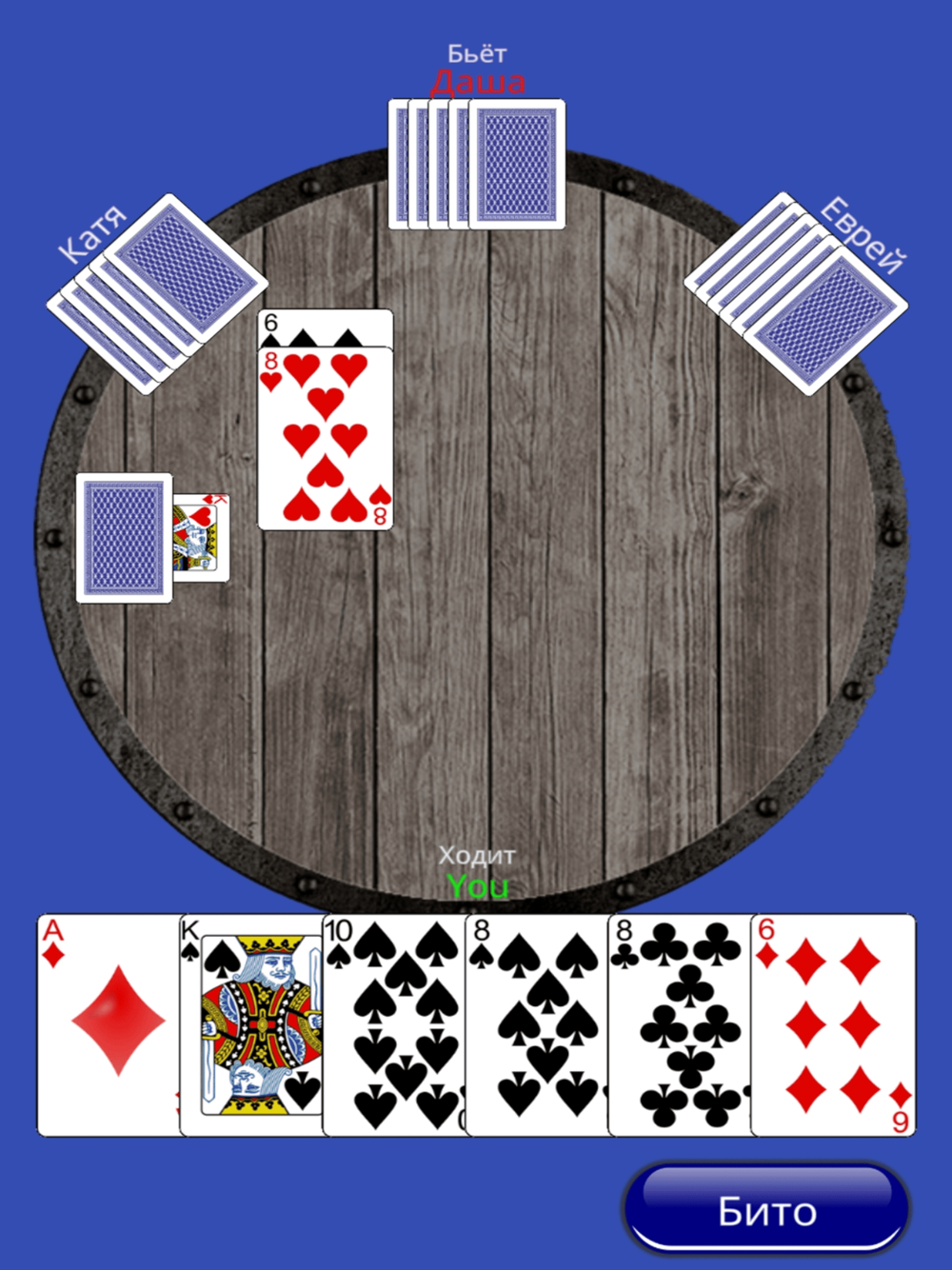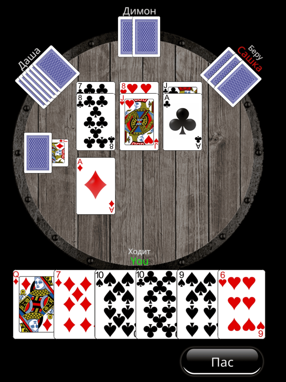 Классическая игра в карты «Дурак». Режимы игры: переводной и подкидной дурак. Режим игры меняется в настройках, а так же задается количество игроков.