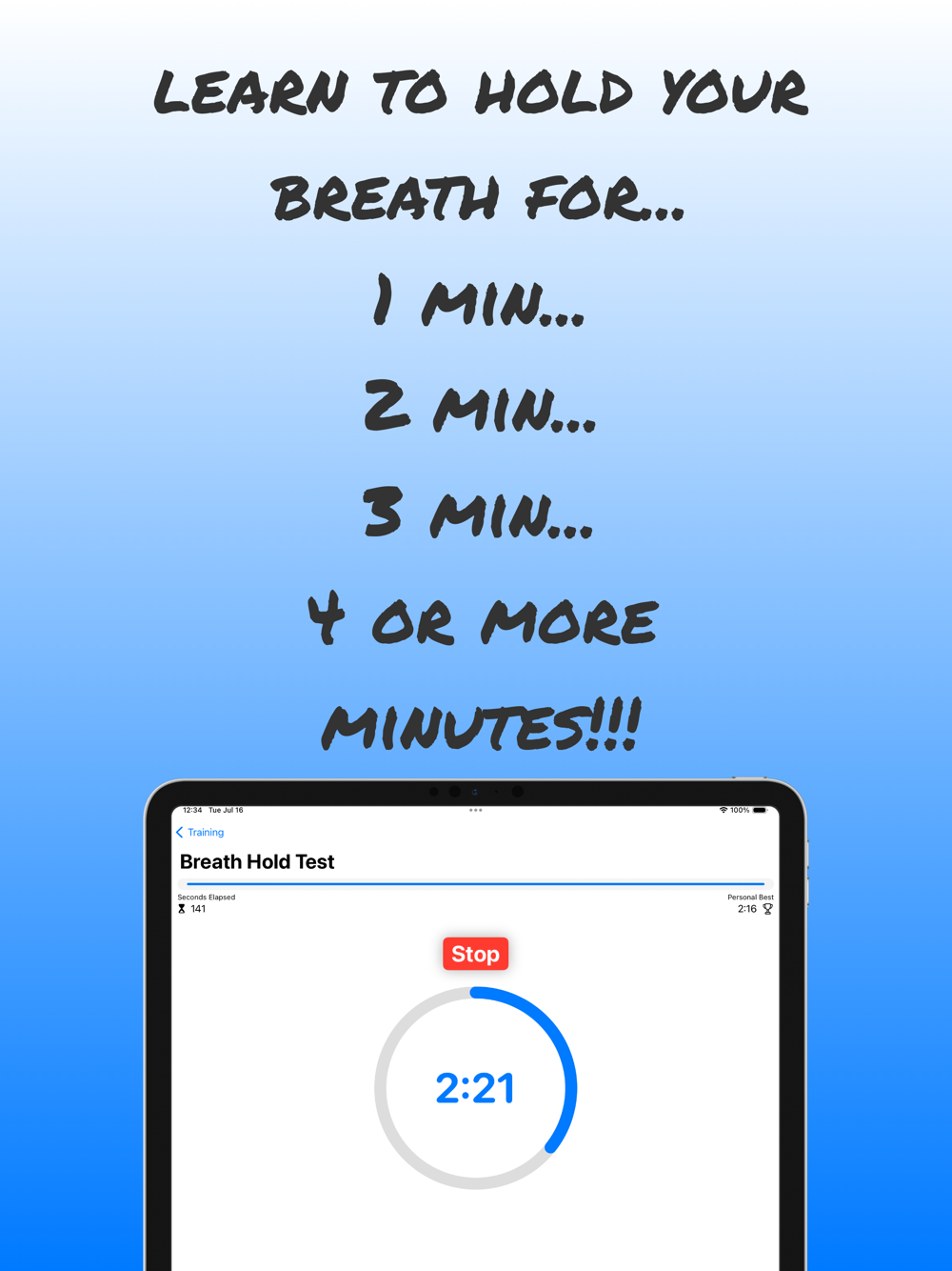 - Track Your Progress: Log every session effortlessly and watch your breath hold times soar with detailed history charts and session summaries.