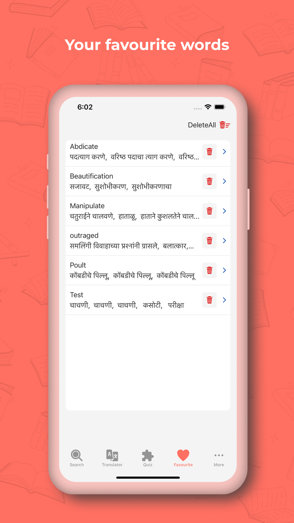 Save your favourite word meanings with ease! Just tap the heart icon, and we'll automatically add the word to your favourites list. Access your saved words effortlessly anytime you want through the 'Favourites' option in the tab bar at the bottom.