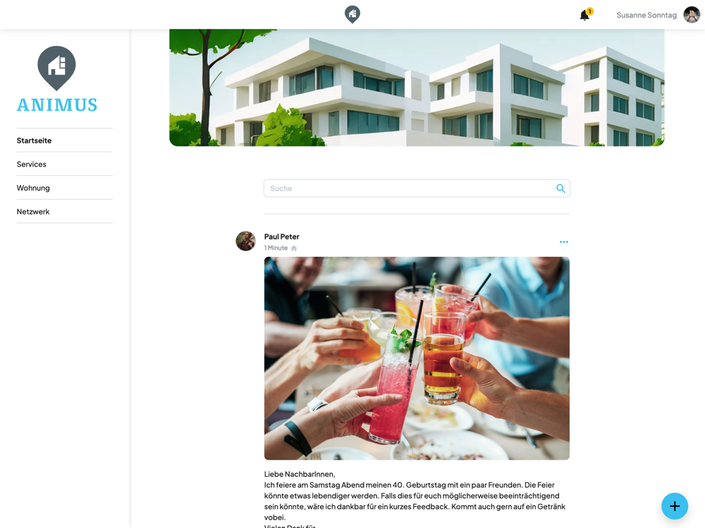 Die ANIMUS-App erhöht die Lebensqualität im Alltag, indem sie Sie als Bewohner*in mit der Hausverwaltung vernetzt und Ihnen immobiliennahe Dienstleistungen anbietet. Sie stellt Ihnen als User ein digitales Netzwerk für ein lebendiges und urbanes Quartier bereit.