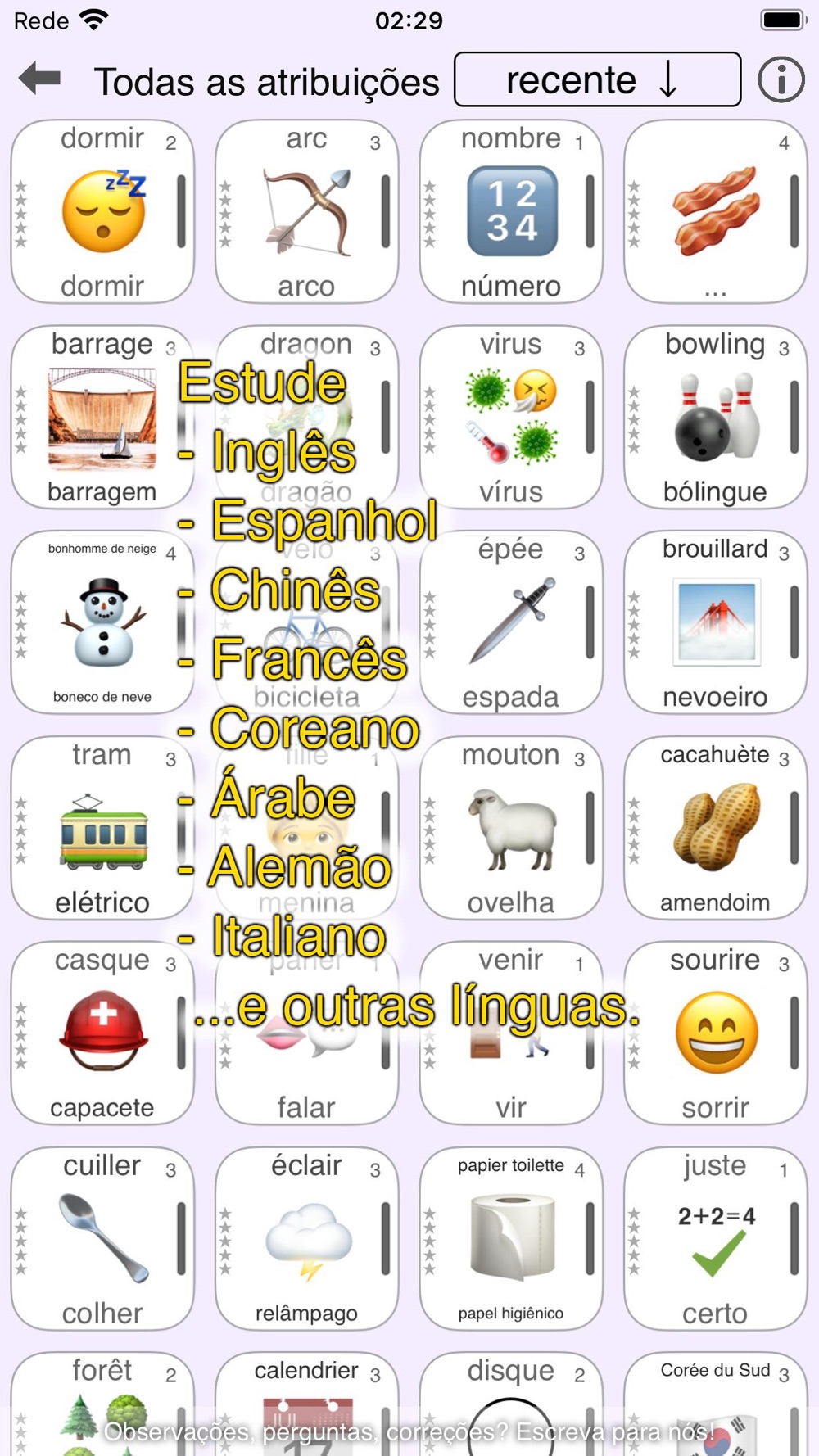 Podes ensinar-te a ti mesmo 500 palavras básicas em mais de 20 línguas, incluindo inglês, espanhol, chinês, francês, árabe, alemão, italiano e muitas mais, usando imagens neste pequeno jogo.
