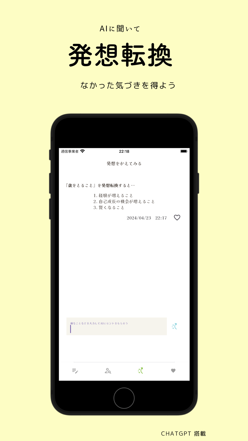 また、「発想を変えてみる」ページもあります。イヤなことや、ちょっと苦手なことを入力してみてください。AIが、返答を返してくれます。何か、気づきが得られるかもしれません。
