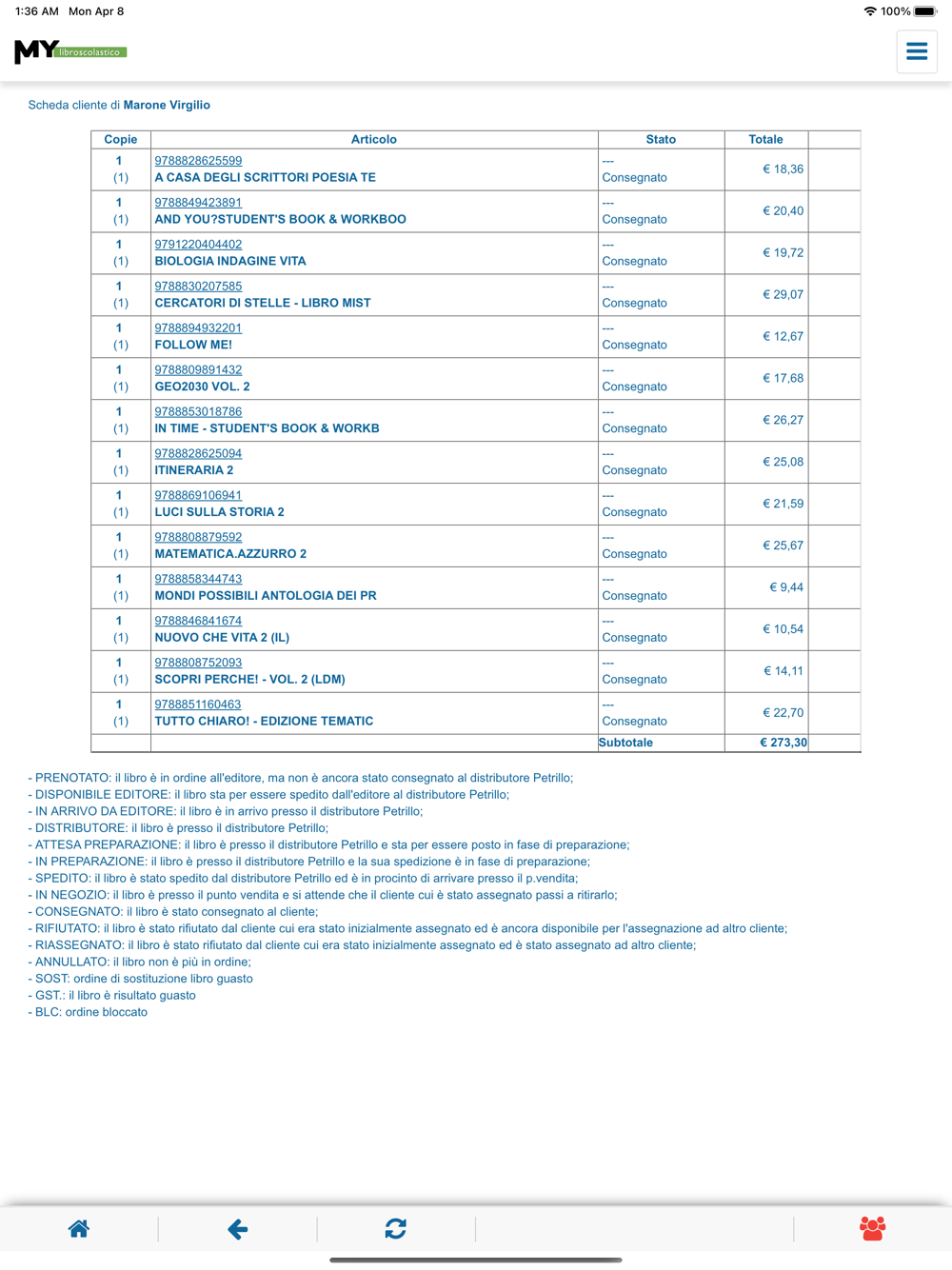 Accedendo all'App con il tuo codice cliente o con le credenziali ricevute mediante l'iscrizione sui siti e-commerce delle aziende partner potrai visualizzare l'elenco di tutti i libri da te ordinati e per ciascuno di essi conoscere lo stato di evasione dell'ordine.