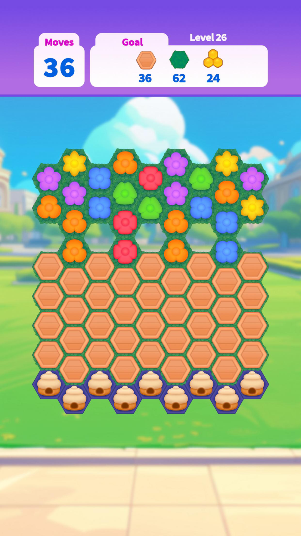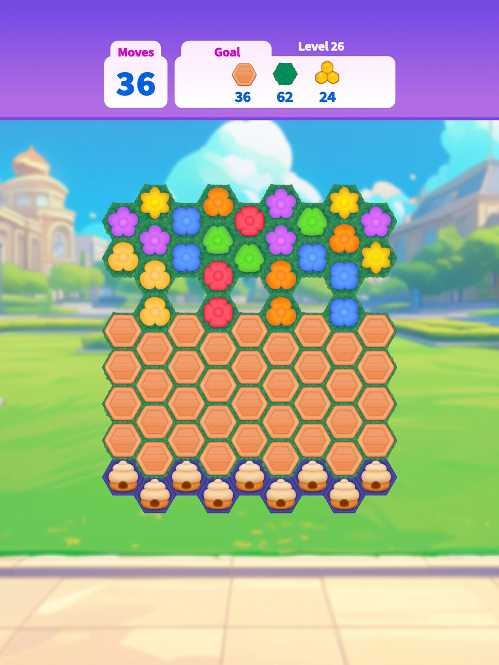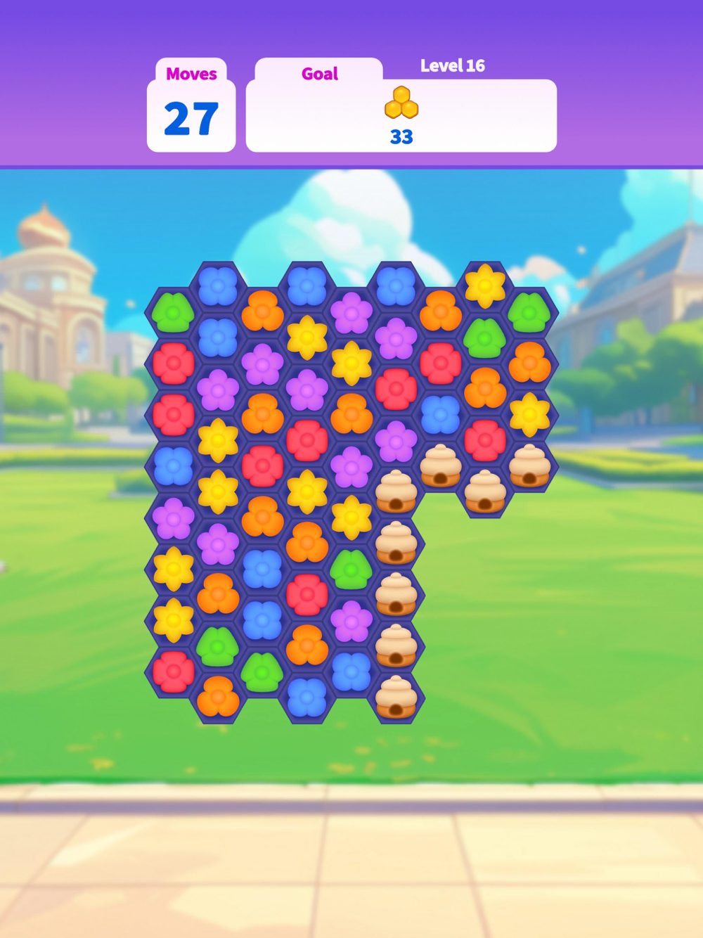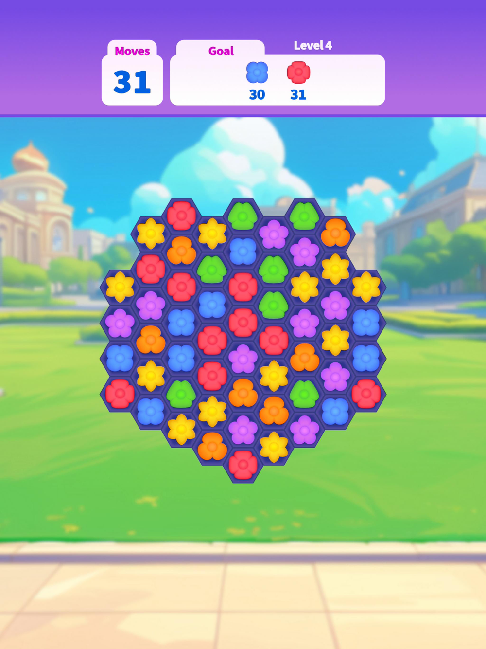 Flower Match is a 6-way match 3 game. All you need to do is swap the same color of flowers in a line before you run out of moves to collect them and advance to the next level.