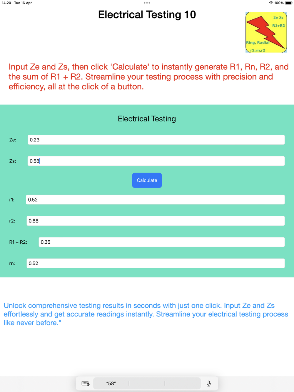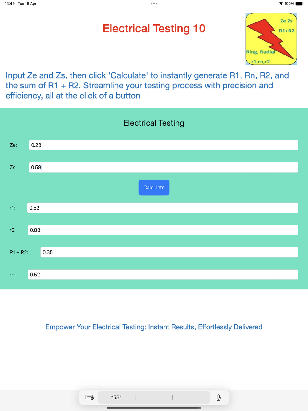 In this latest version of Electrical Testing 10, we're excited to introduce several enhancements to elevate your testing experience. We've listened to your feedback and made significant improvements to streamline your workflow and ensure precision results.One of the key additions is the introduction of a convenient "Reset" button, allowing you to effortlessly clear all input fields and start fresh with each new testing session. This feature simplifies the process, saving you time and ensuring accuracy in your calculations.Additionally, we've refined the user interface to focus solely on the essential inputs, Ze and Zs. By restricting input fields to these critical parameters, we've created a more intuitive and user-friendly experience, eliminating distractions and allowing you to quickly input the necessary data with ease.With these updates, Electrical Testing 10 continues to empower professionals in the electrical testing field, providing them with the tools they need to perform tests with confidence and efficiency. Upgrade now to experience the enhanced functionality and seamless usability of Electrical Testing 10!