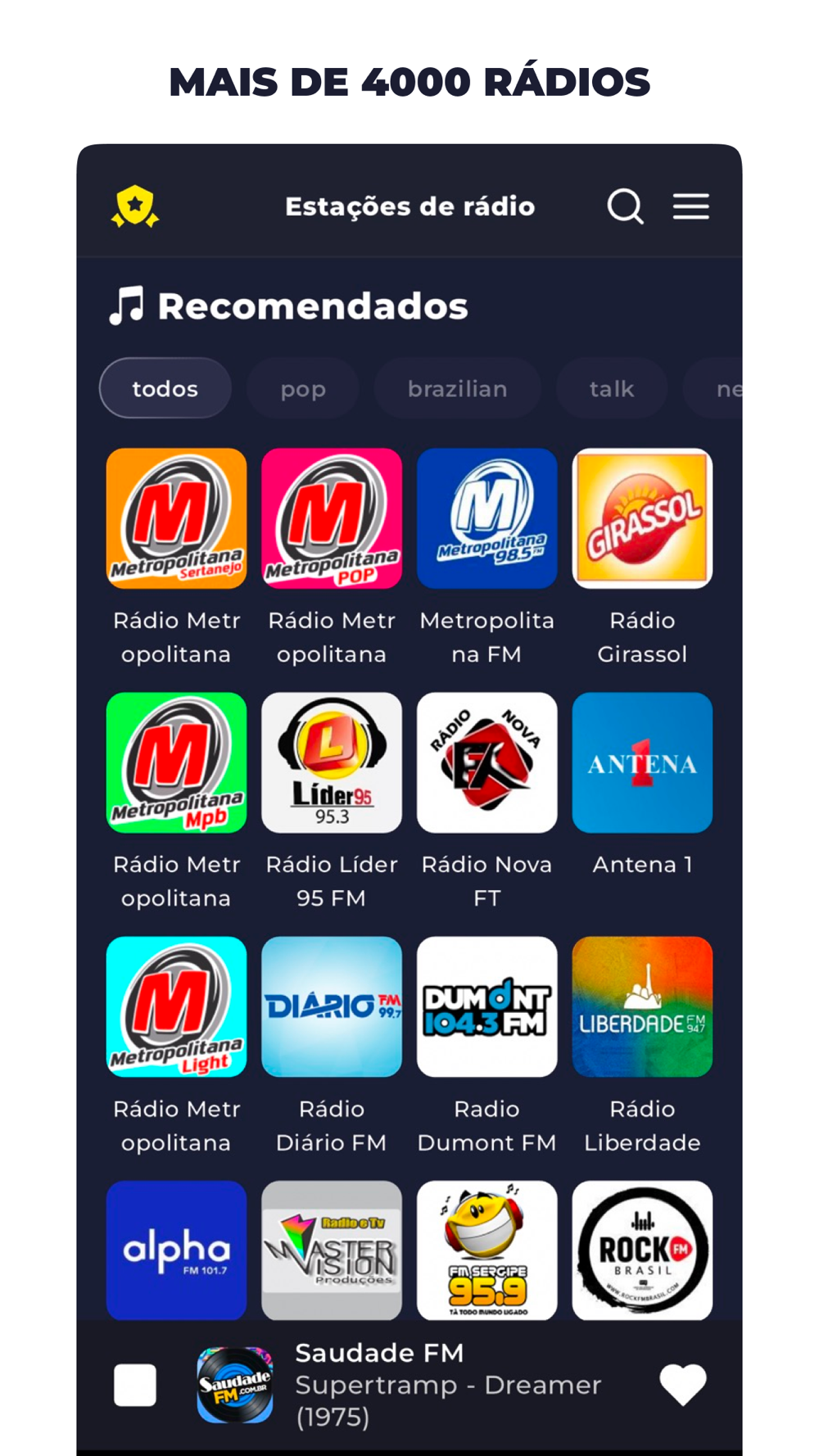 Mais de 4000 estações com classificação por gênero, playlists, músicas mais tocadas e muitos recursos úteis.