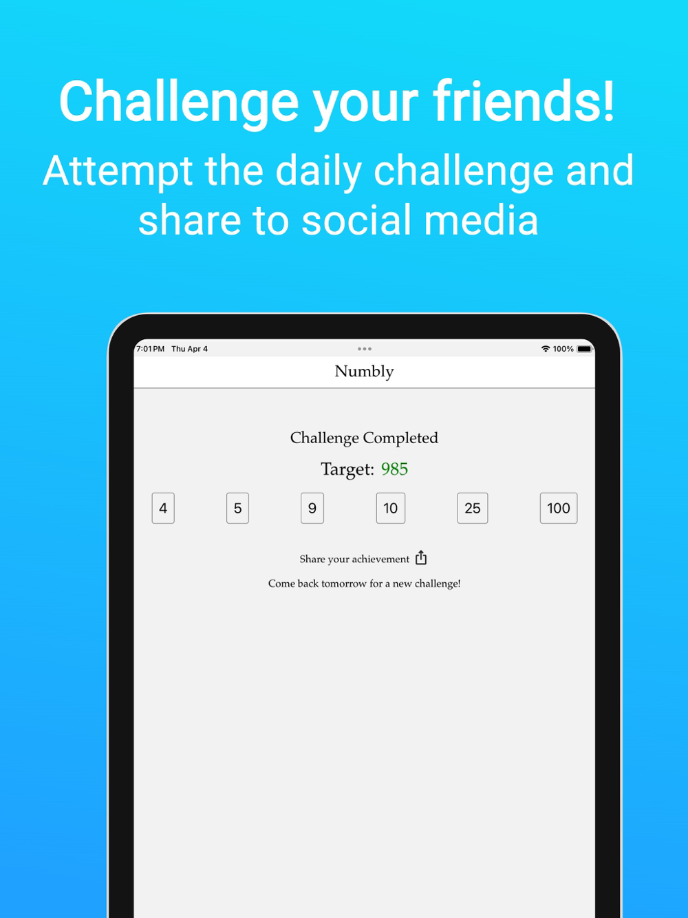 Embark on a daily journey of numerical mastery with our immersive puzzle game! Each day, face a fresh challenge, utilizing six numbers and operators to crack the target sum. But the excitement doesn't end there – share your triumphs with friends on social media, fueling the competitive spirit! Immerse yourself in engaging gameplay, where strategic planning and clever arithmetic lead to victory.