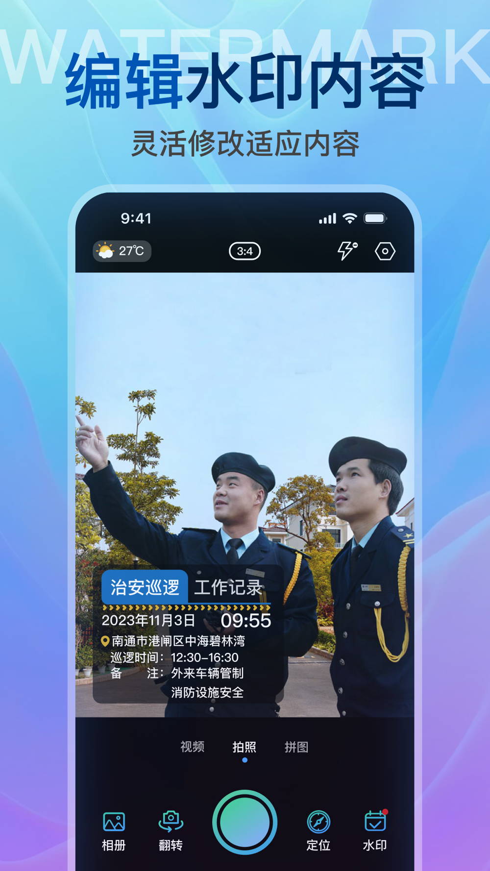 非常好用的一款打卡水印相机,让您轻松为照片和视频添加精美的水印。无论是想要在照片上添加日期、时间、地点、备注等信息,还是想要为视频添加个性化的水印,本相机都能满足您的需求。