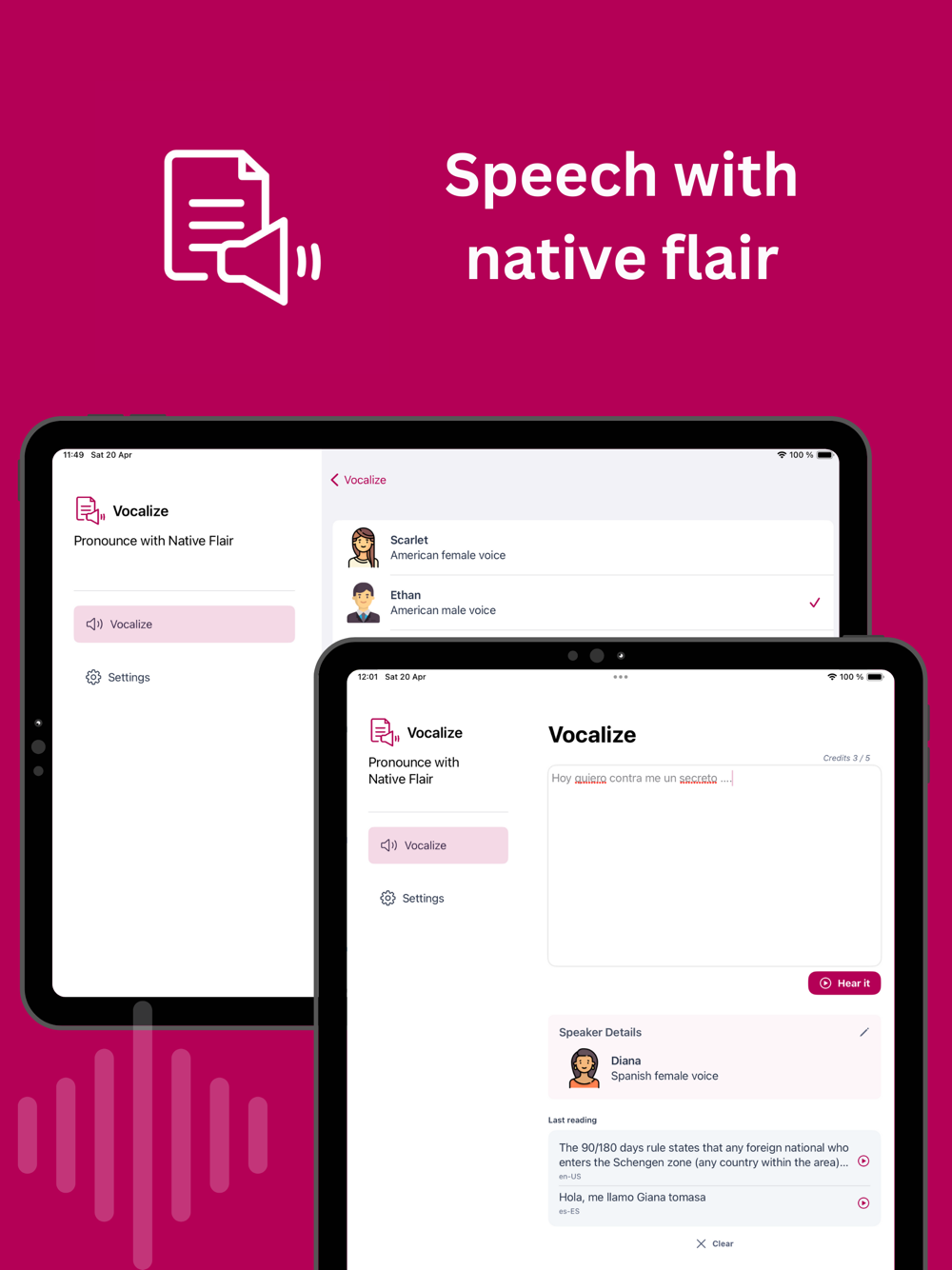 Com apenas um toque, descubra a pronúncia precisa de qualquer palavra, frase ou texto carregado de um arquivo, e observe como um falante nativo articula.