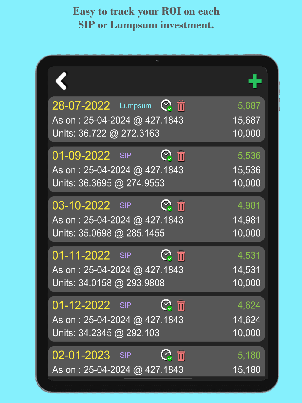 Investment Entry: Adding SIP and lump sum investment details is a breeze. For lump sum investments, just enter the amount and date, and the app will fetch NAV and units automatically. Similarly, for SIP investments, provide start date, amount, frequency (Weekly, Fortnightly, Monthly, Quarterly), and instalments, and let the app handle the rest.
