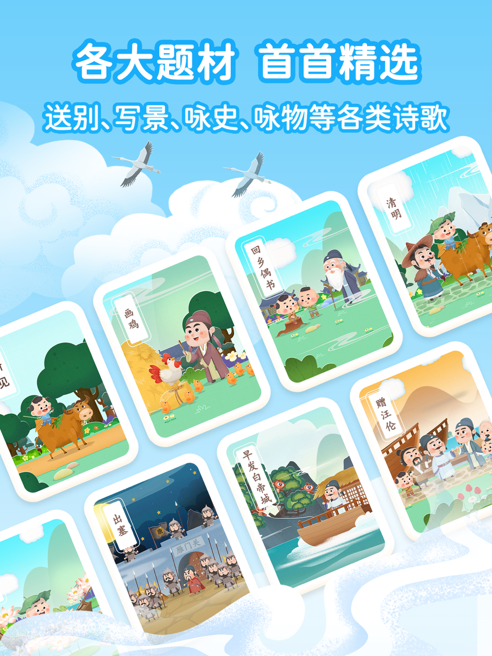 每首诗都配以精美的画面、专业的配音,提升孩子对古诗的兴趣,帮助孩子轻松掌握诗词及相关知识。