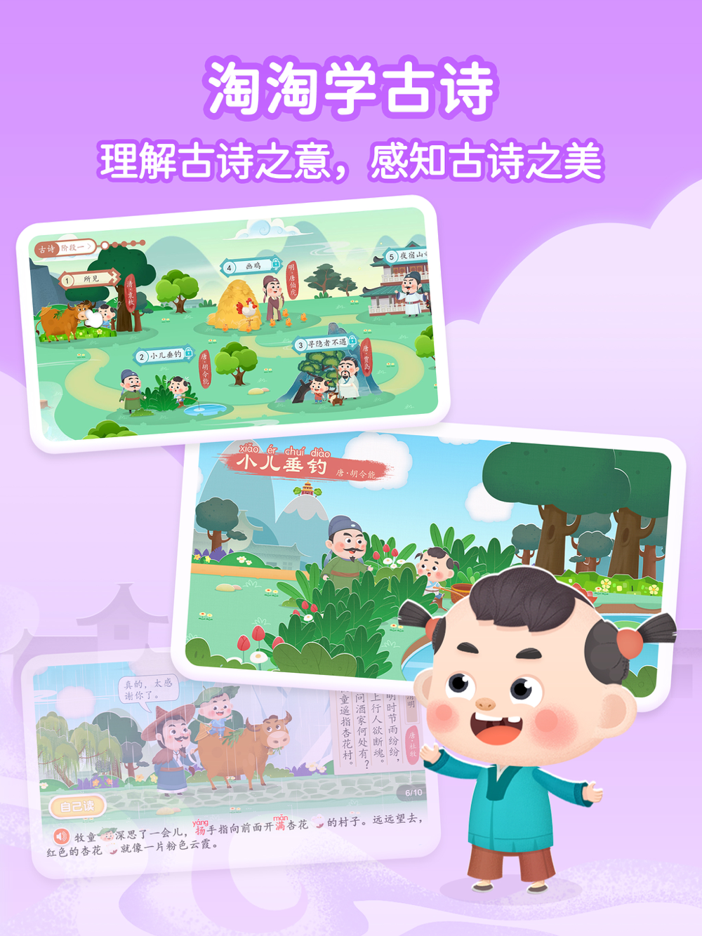 《淘淘学古诗》为儿童设计的古诗启蒙软件,精挑细选100首古诗绘制成绘本,200+拓展音频,配以专业朗读,让孩子在趣味互动中学习和了解中国传统文化。