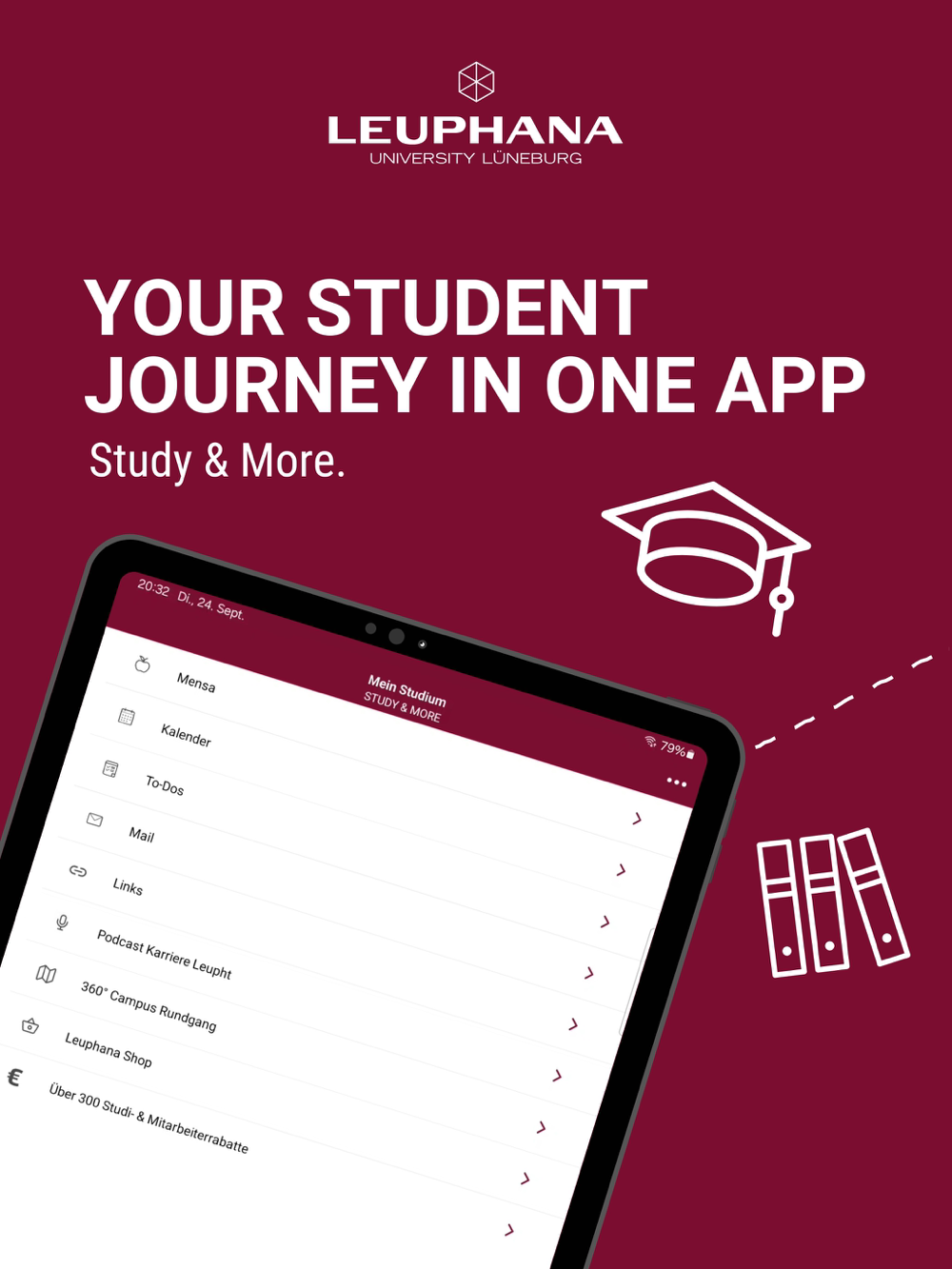 The Leuphana University of Lüneburg app offers you everything you need to start your day-to-day studies well prepared, whether you have just started your degree programme or are already on your Master's degree.