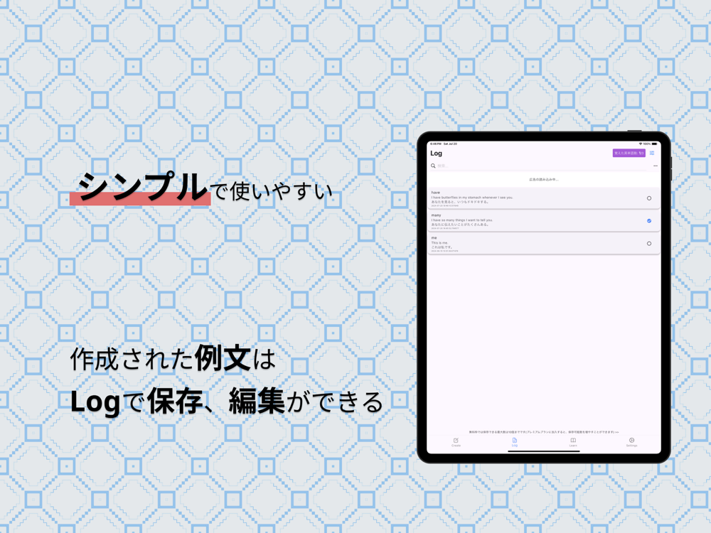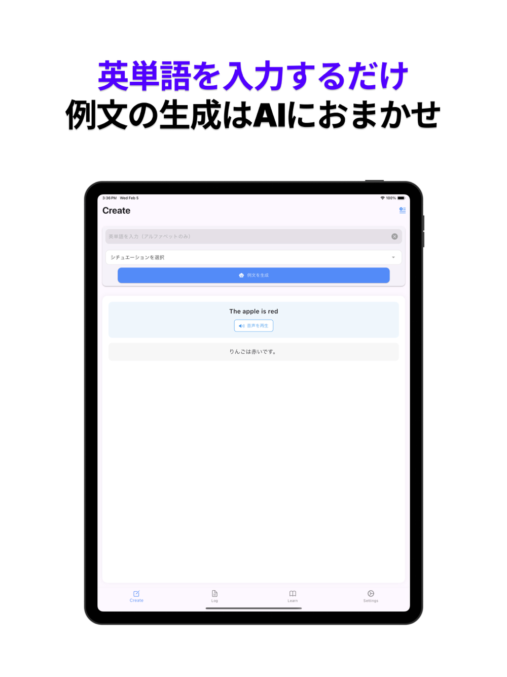 The created example sentences are saved in the Log, and you can practice only the example sentences you created! There is also an audio playback so you can understand the English pronunciation.