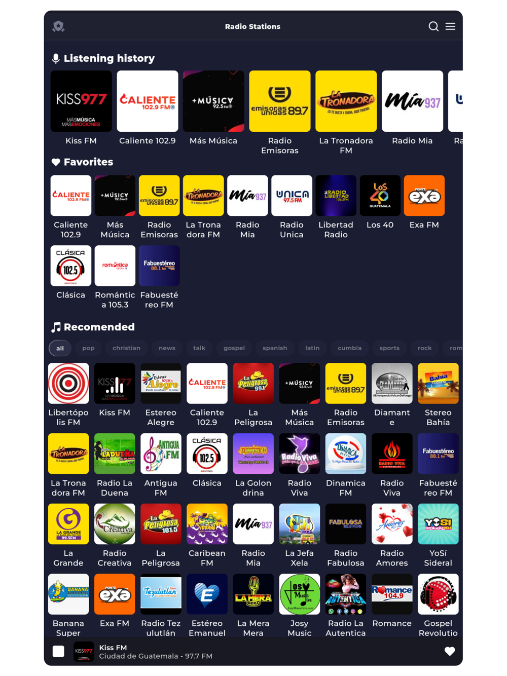 All Guatemalan radio stations in one app. Over 400 stations with genre sorting, playlists, top songs, and many useful features.