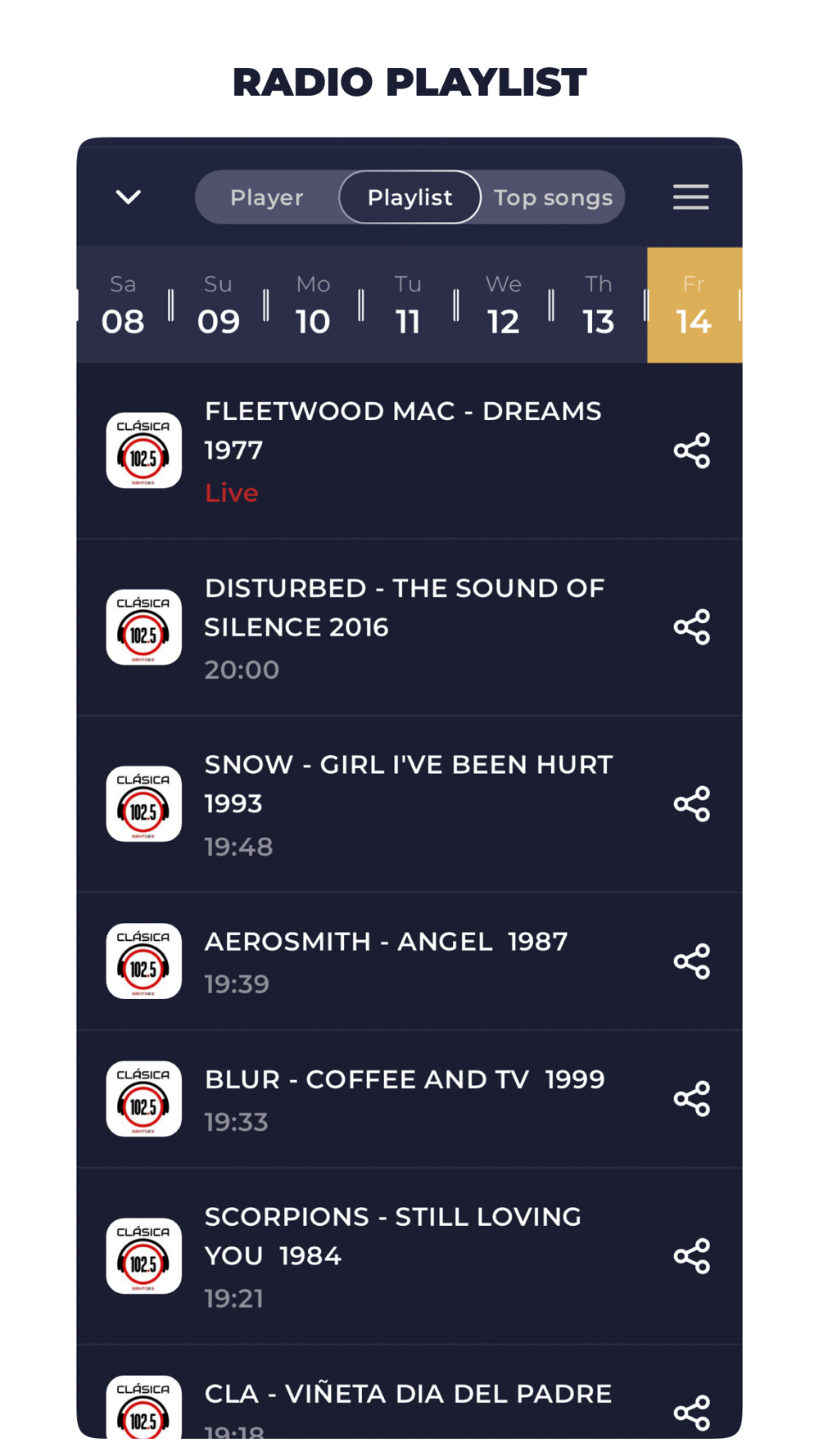 Radio station playlists – view the latest songs played on each station.