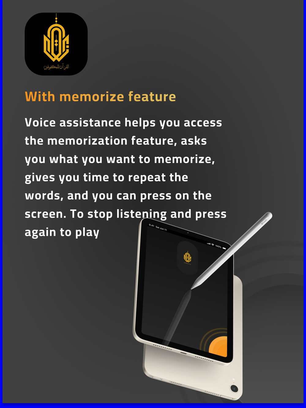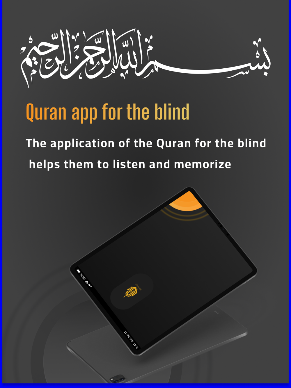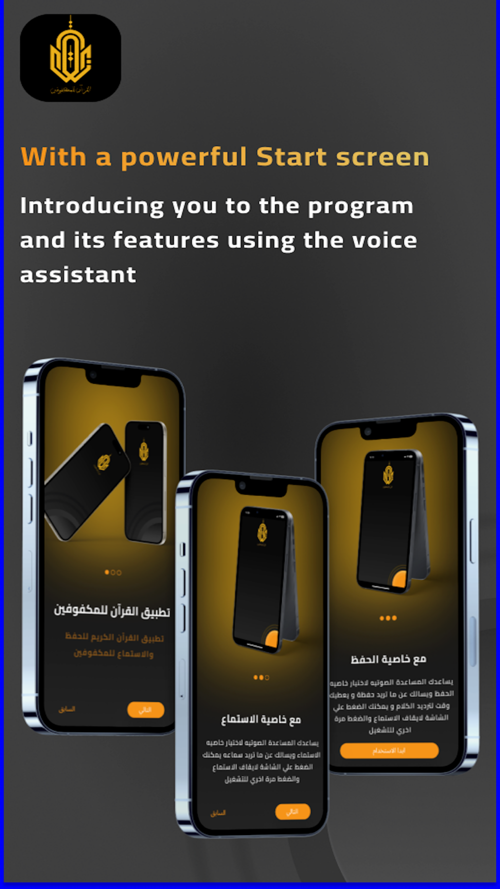A innovative application aimed at assisting the visually impaired in listening to and memorizing the Quran with ease and convenience. The application features an advanced voice recognition system that allows users to interact naturally with the device, enabling them to easily search for chapters through speech. Additionally, the application includes interactive features that facilitate users in selecting the chapters they wish to listen to, memorize, and track their progress in memorization. With this application, visually impaired individuals can enjoy a distinctive experience and effective assistance in studying and reciting the Quran.