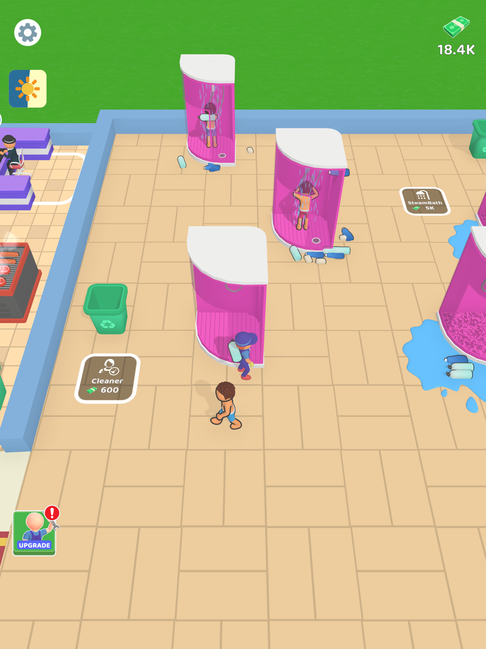 Upgrade & Expand: Use your earnings to unlock new areas and amenities, from steam baths to jacuzzis.