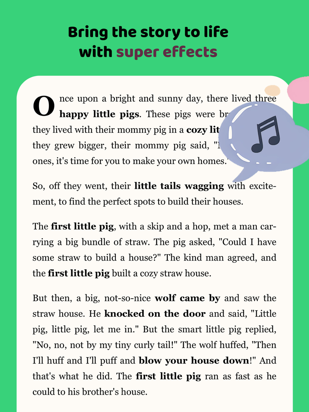 Choose any storybook and read aloud, or enjoy our curated audiobooks. Watch as gentle music, magical sound effects, and twinkling animations sync with your voice or narration, creating an immersive storytime experience that kids adore.
