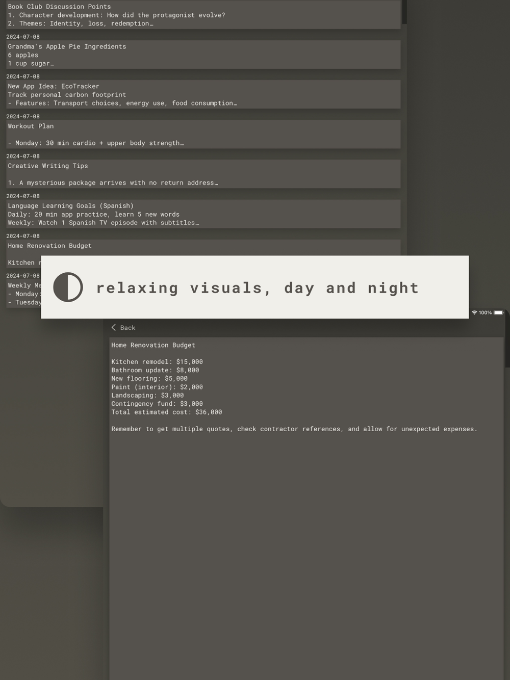 Whether you're writing in bright daylight or late at night, Memomium's day and night modes provide a comfortable viewing experience in any lighting condition.