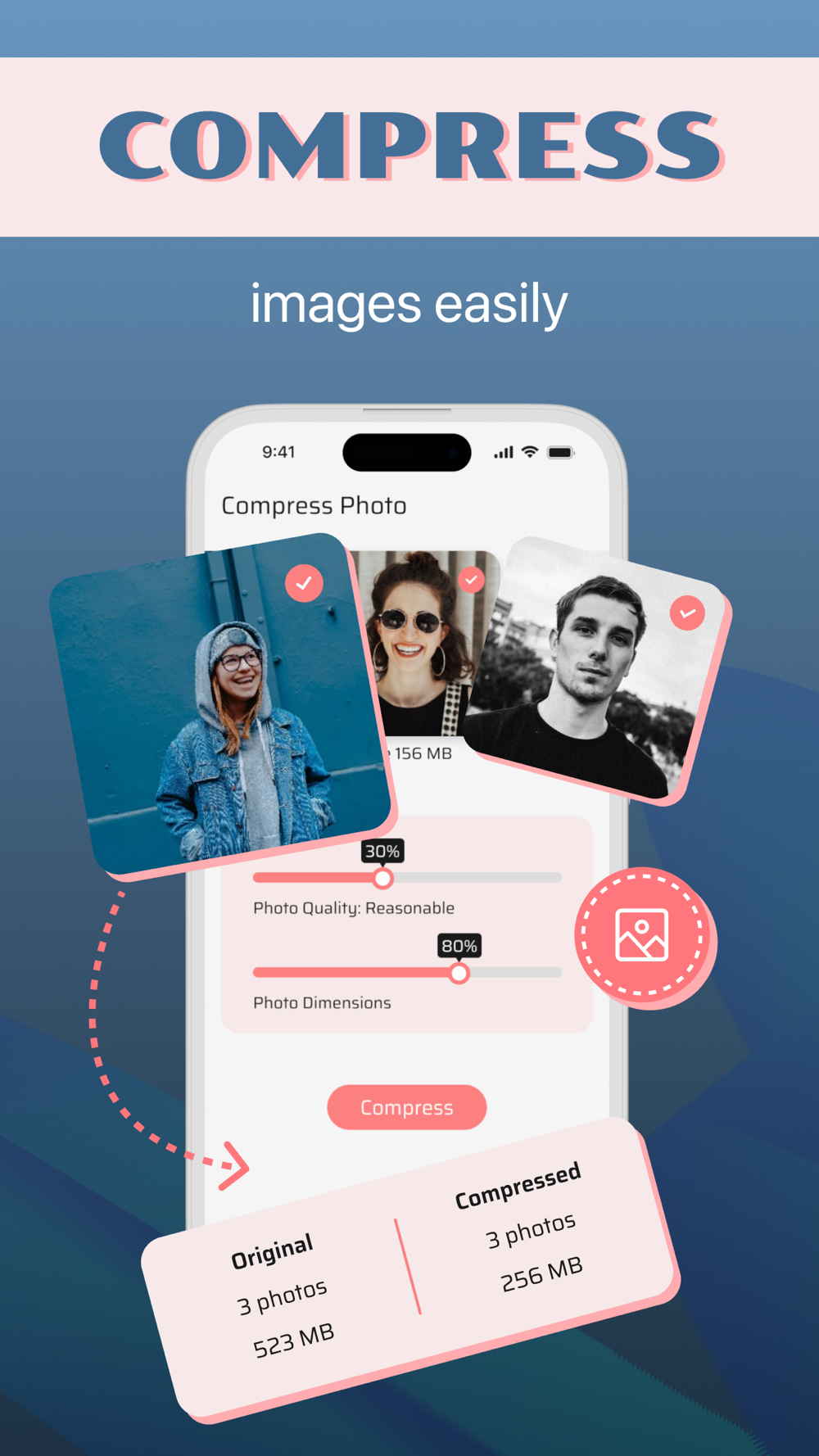 Effortlessly compress photos to reduce file size while maintaining quality. Select your photos, adjust dimensions, and download the compressed results quickly.