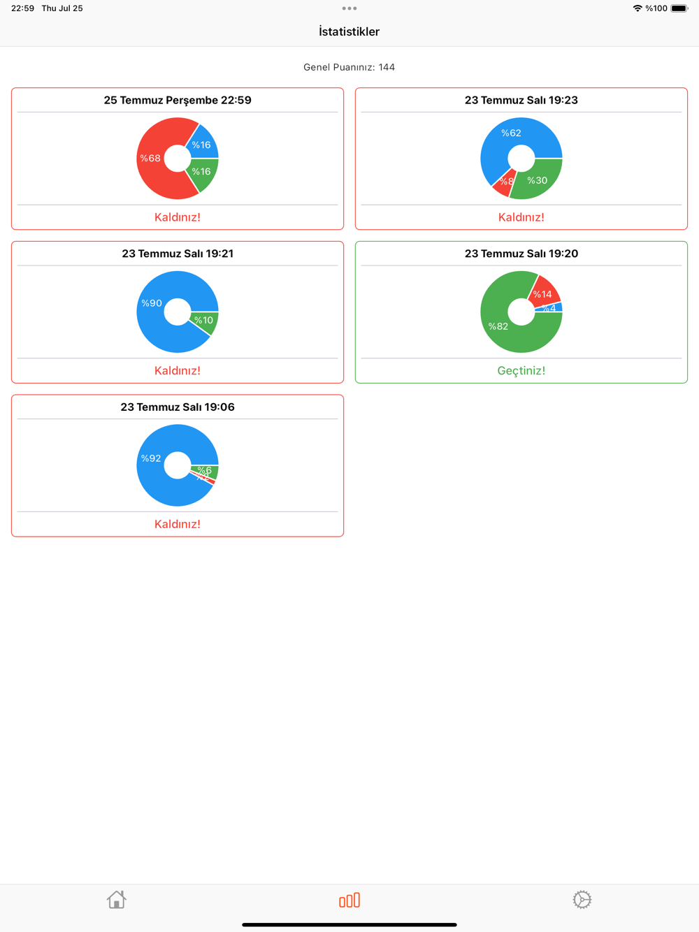 Çözdüğünüz her sınavın sonuçlarını takip edin. Hangi konularda güçlü, hangi konularda daha fazla çalışmanız gerektiğini görün.