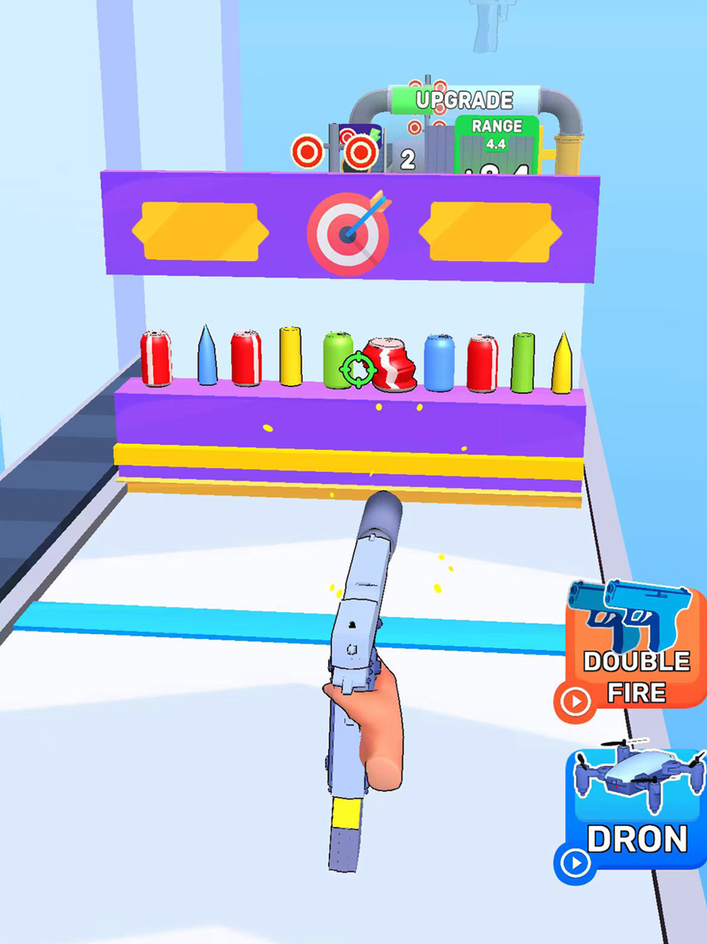 You can use a handgun in the game to shoot various obstacles, power-up cards, and items to achieve different effects. You can also combine them to increase your attack power.