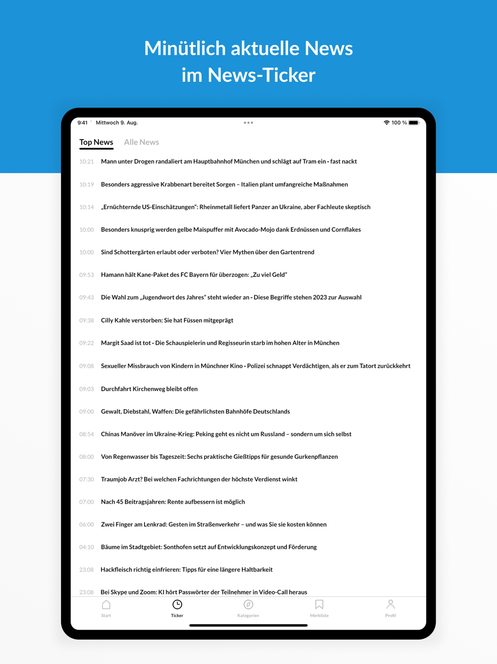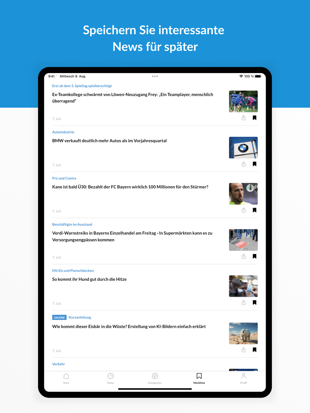 Außerdem können Sie interessante Meldungen über die Bookmark-Funktion speichern und später in Ihrer Merkliste abrufen sowie alle Artikel teilen.