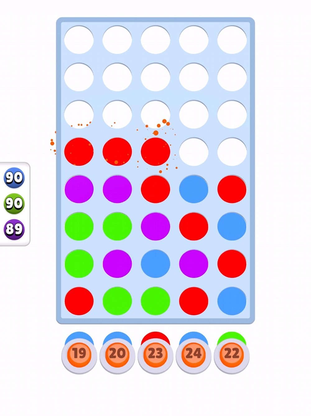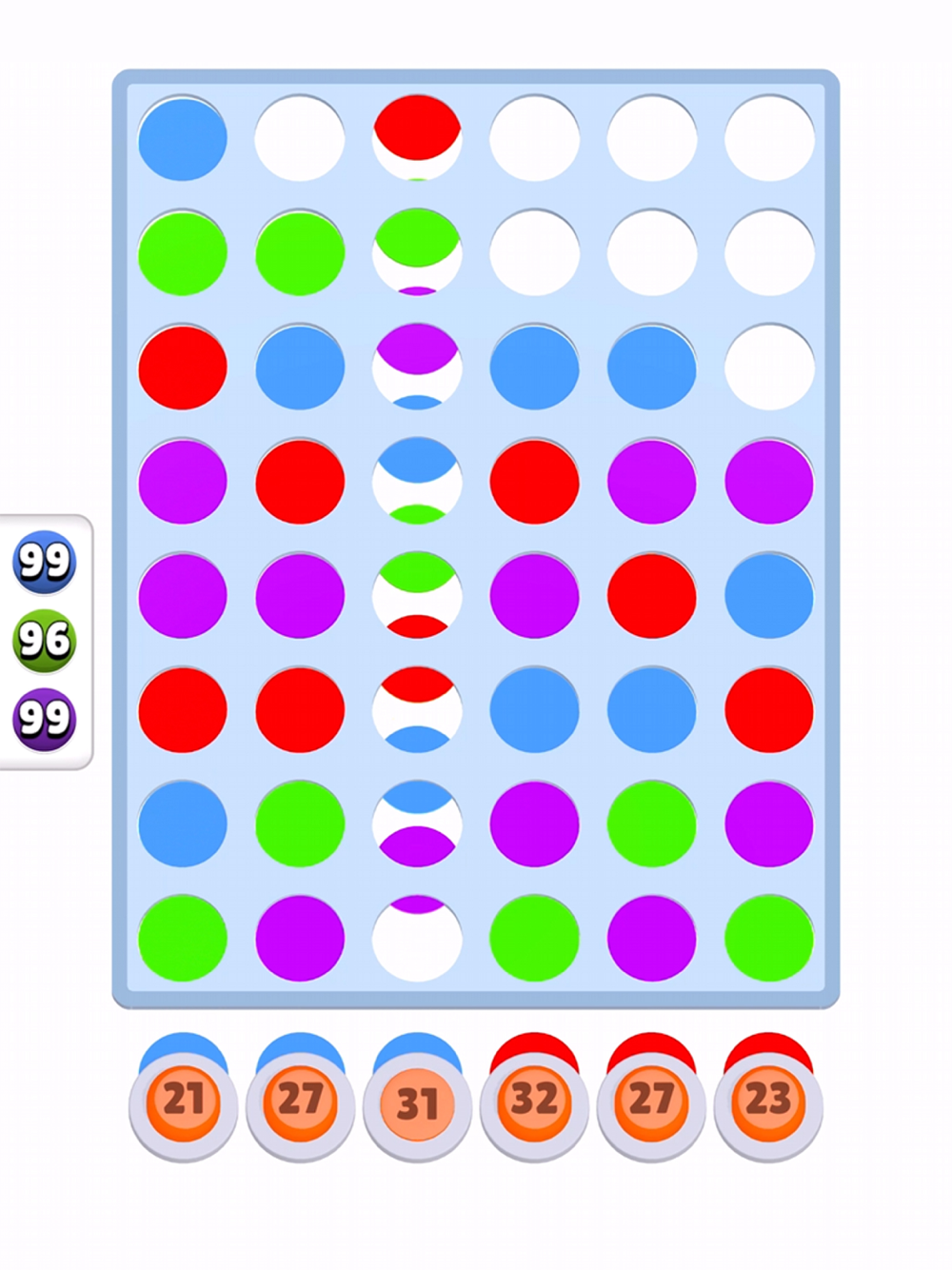 Push to match is a match-4 concept with buttons to trigger the move the dots in respective columns up one row at a time. By aligning 4 of the same colored dots in the same row, you can achieve the required missions to proceed through levels.