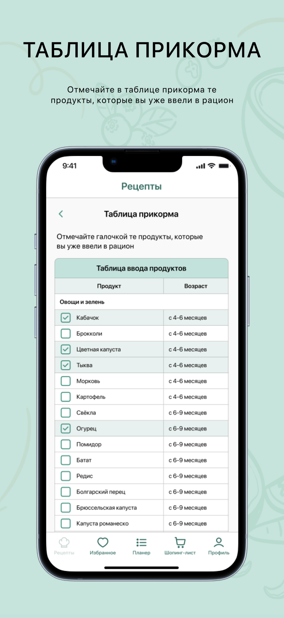 Наше приложение включает в себя подробную таблицу прикорма, которая поможет вам отслеживать введение новых продуктов в рацион малыша. С помощью неё вы сможете следить за прогрессом и точно знать, какие продукты уже введены в рацион.