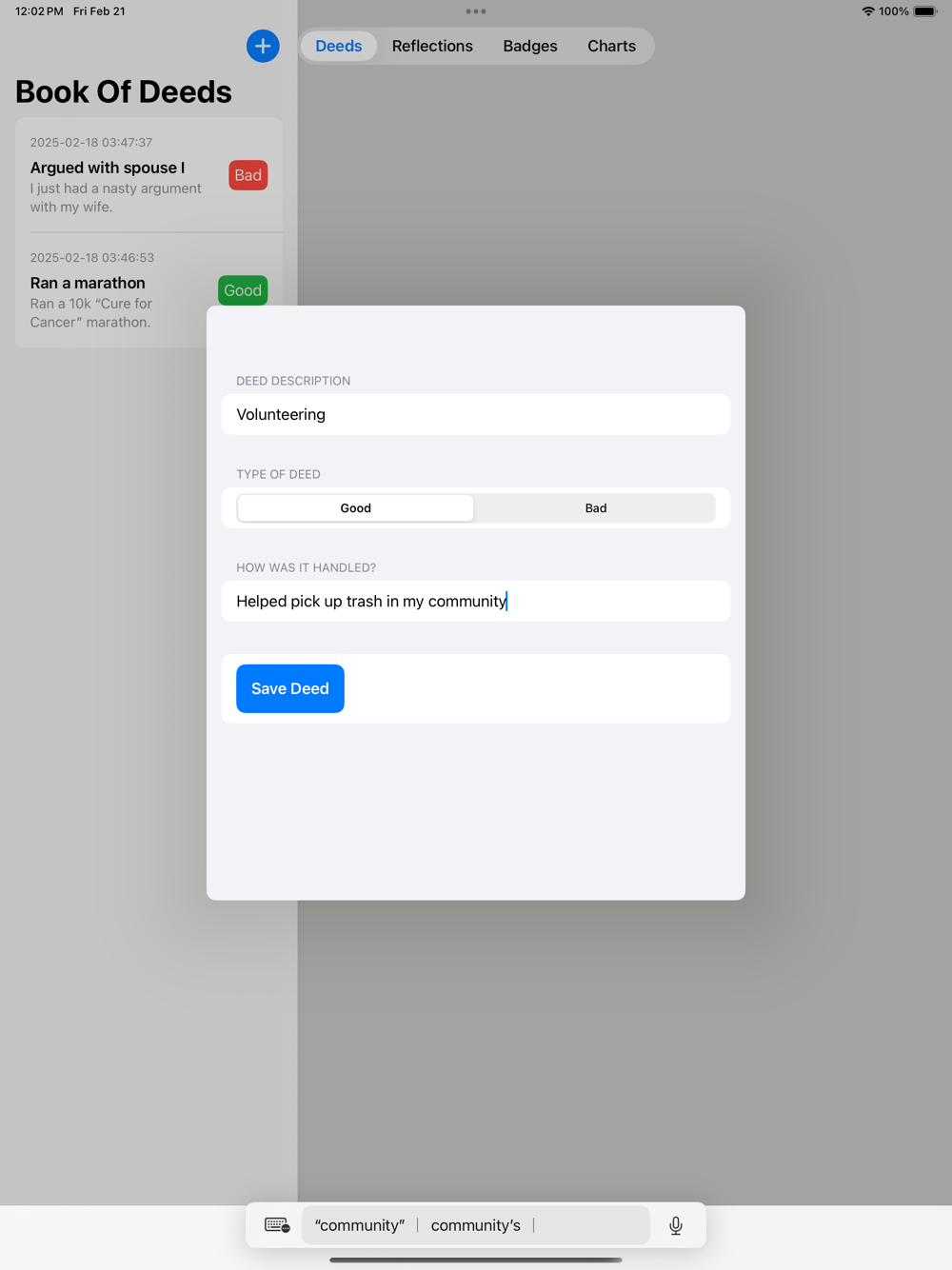 Life is all about balance, and every action, whether good or bad, shapes who we are. BookOfDeeds helps you take ownership of your actions by tracking your daily deeds, reflecting on your behavior, and striving to create positive change.