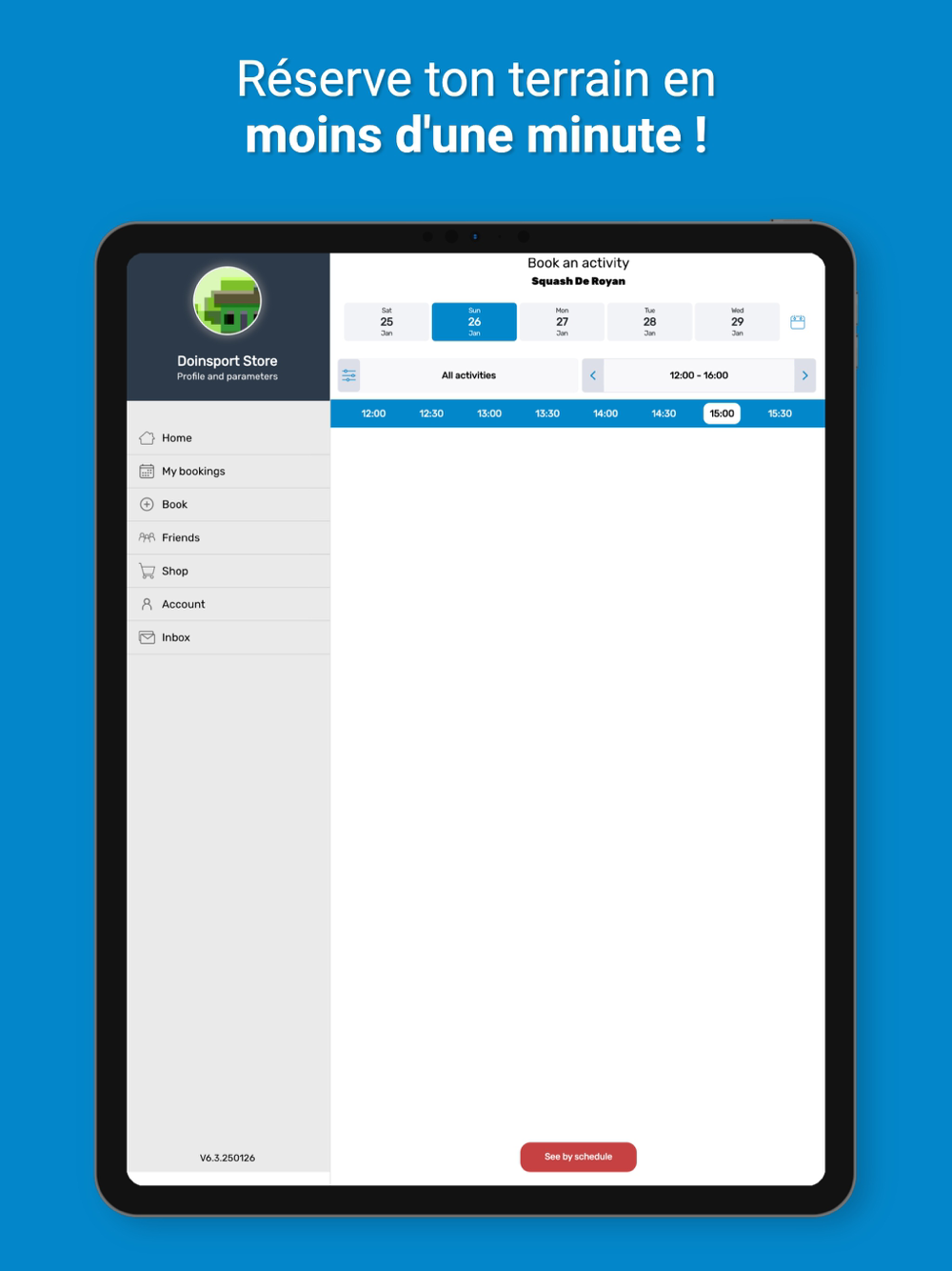 Fini la corvée de réservation ! Avec l'application tu n'as plus qu'à accéder aux créneaux disponibles et à en choisir un. Le club recevra alors automatiquement ta réservation.