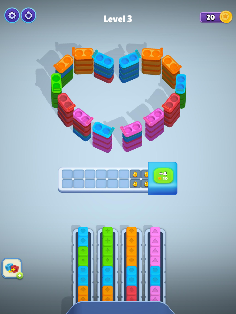 Colorful cubes line up at the bottom of the screen, waiting for your touch. Tap a cube, and it will fly to a matching-colored can stacked above. If there’s no matching can available, the cube moves to a slot—but be careful! If the slot fills up, you fail the level!