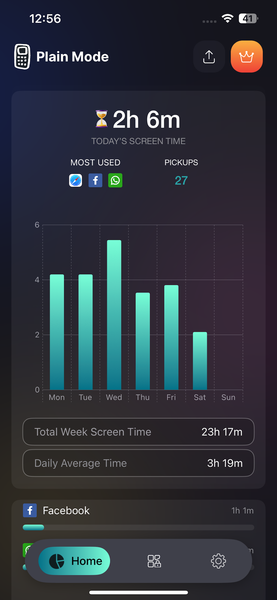 Plain Mode keep track your screen-time usage and shows you the statistics in a graphical representation.