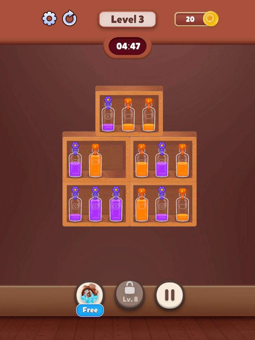 Get ready for a satisfying puzzle experience! In Merge The Bottles, your goal is to combine colorful bottles and fill them to the top to clear the shelves.